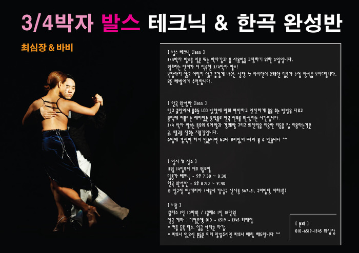 작성자최심장 작성자 본인 여부 작성자 작성시간 16.11.10 3/4박자 발스를 입문 또는 박자감과 몸 사용법을 교정하기 위한 수업입니다.