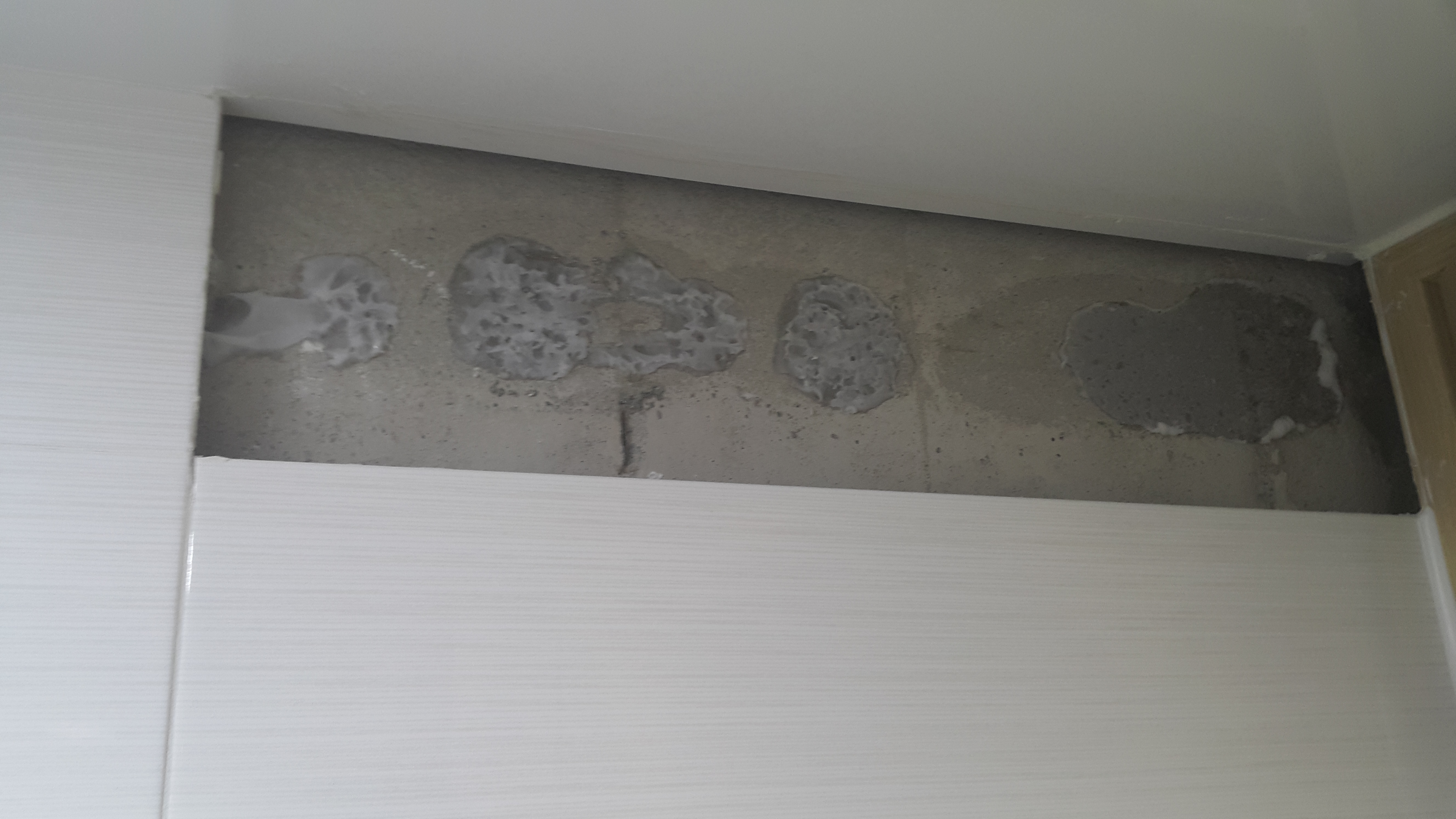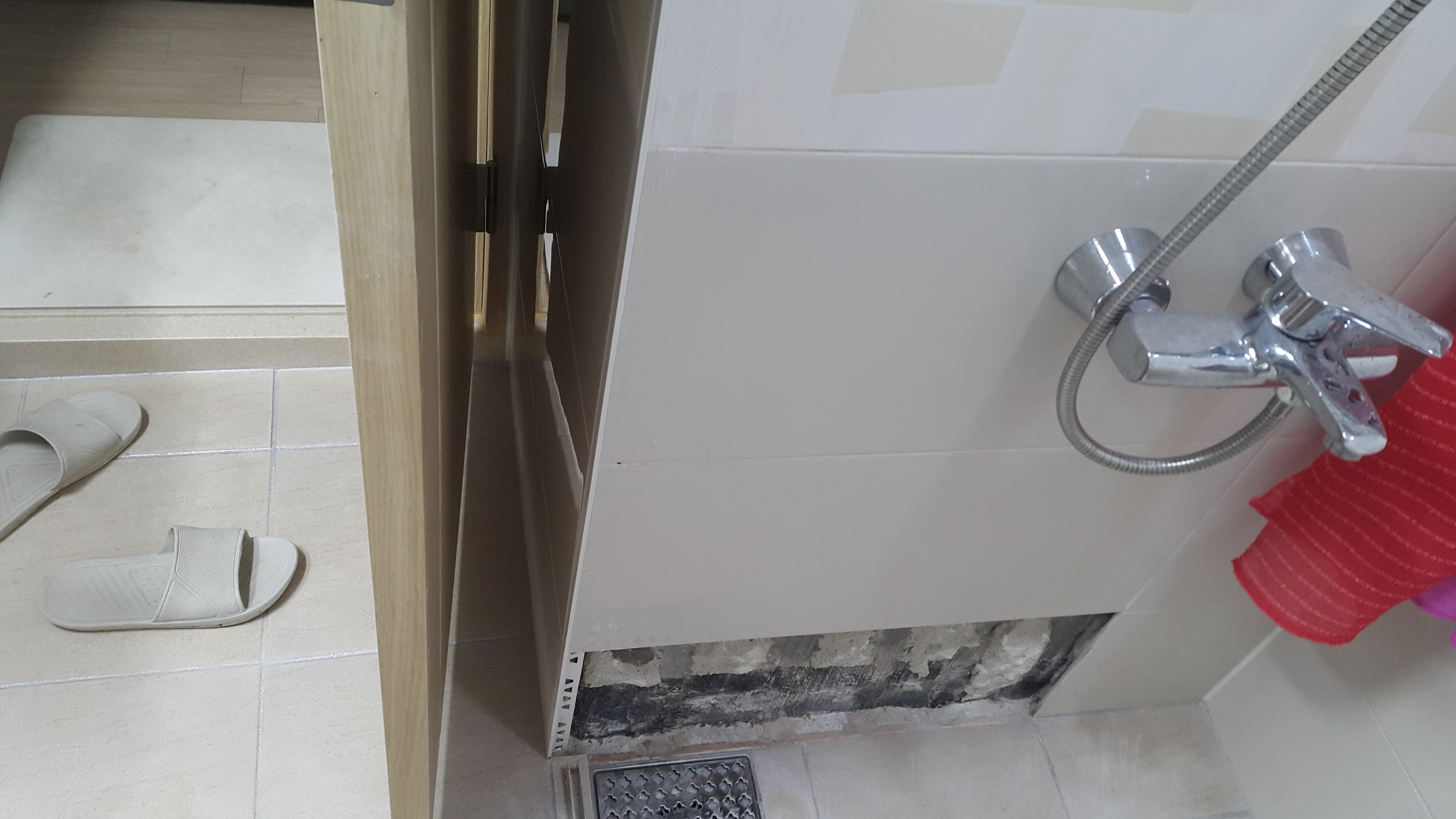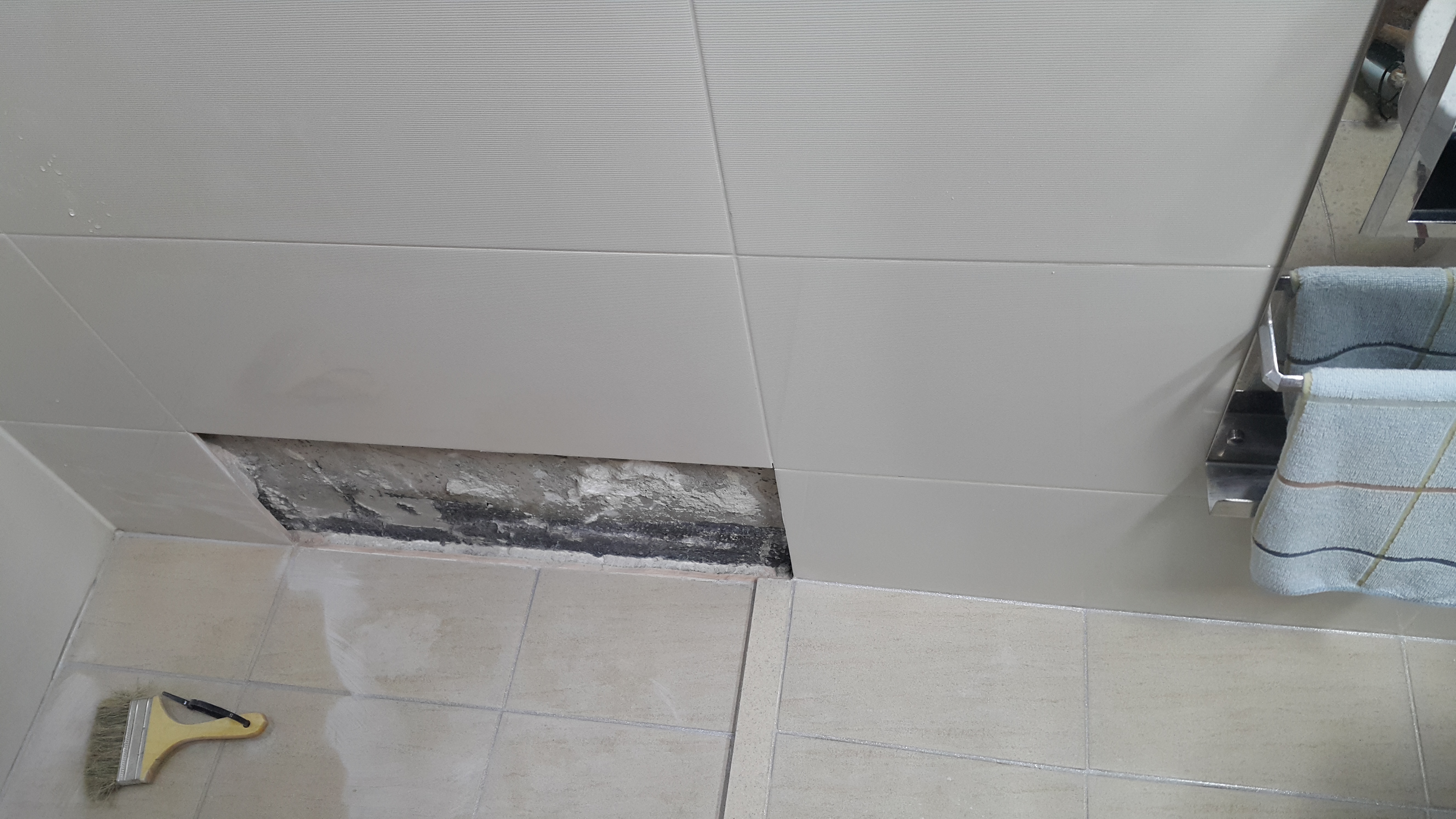 바닥 쪽 벽에 실금이 가 있는 걸 작년 가을인가 겨울인가에 알게 되어서 AS 신청했었는데 오늘 AS를 받았습니다. 공용 욕실은 예전에 한번 했는데, 부부 욕실에도 실금이 가 있었네요.