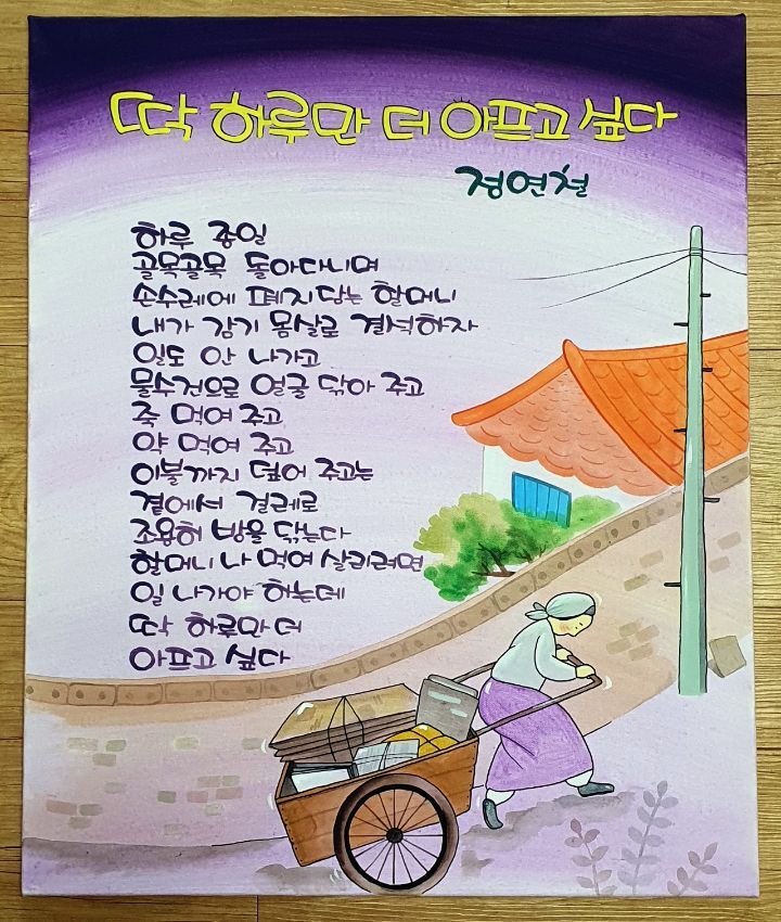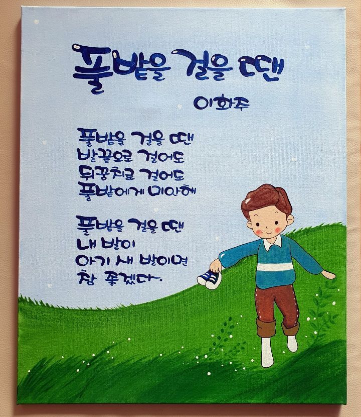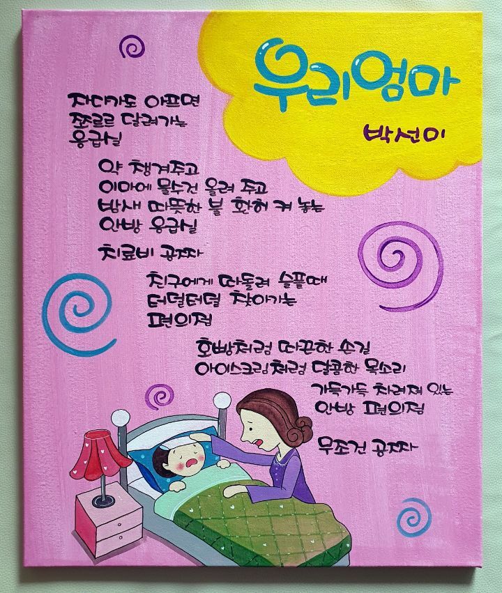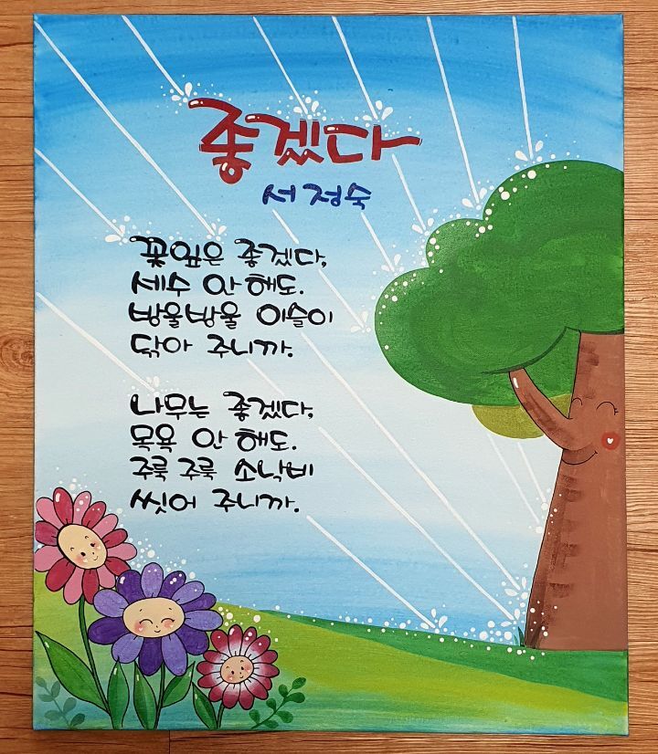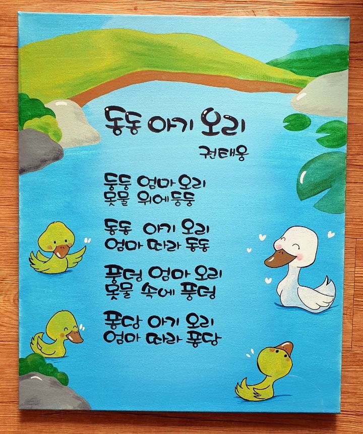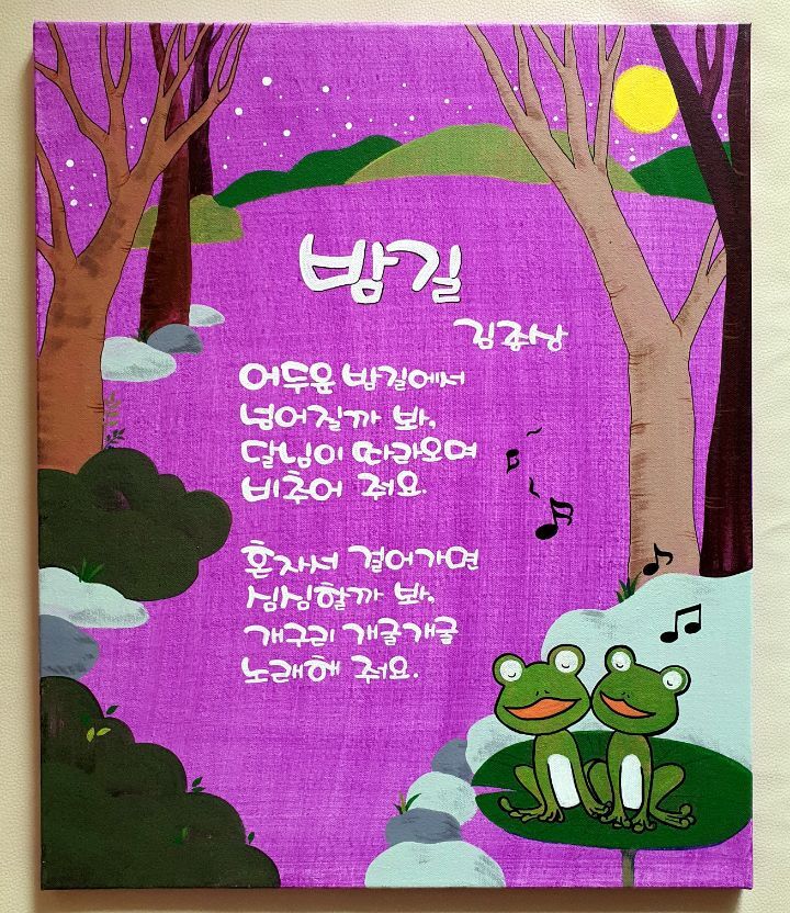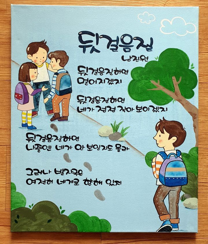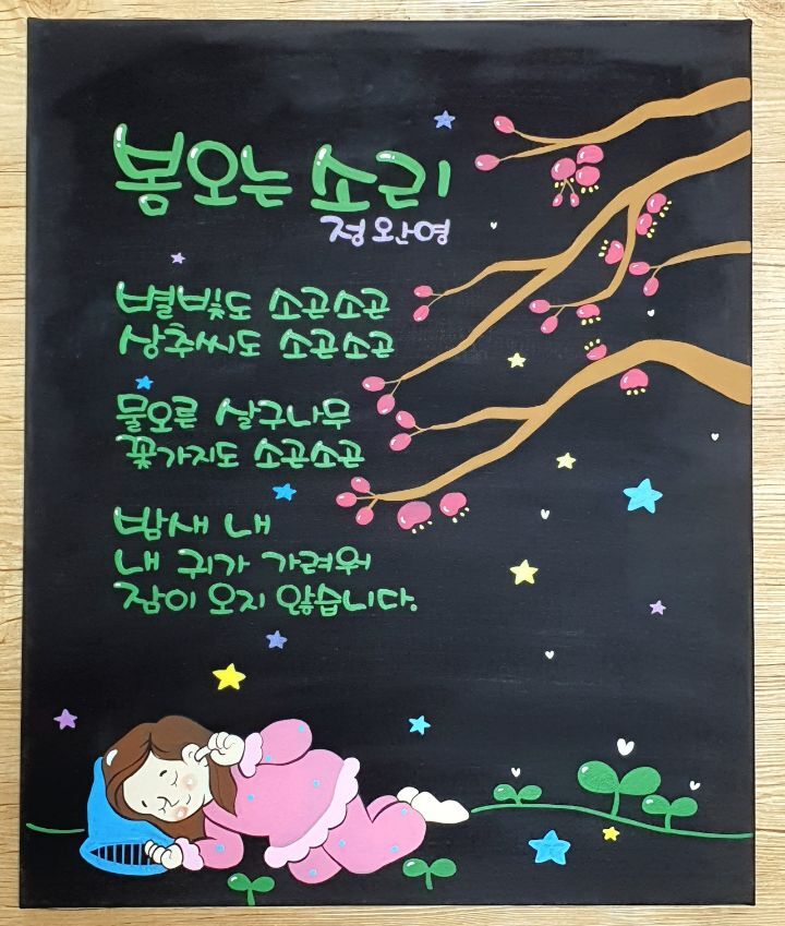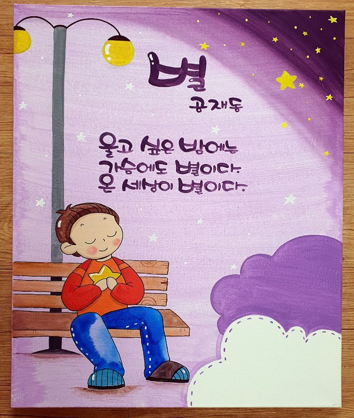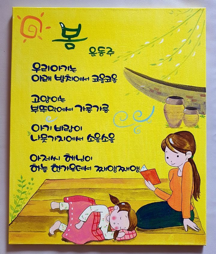 젯소칠2번->바탕배경색2~3번->밑그림(연필,파스텔연필)->이미지채색->동시쓰기->검정라인->하이라이트등..->바니쉬칠2번->중화제1번->뒷면에 마끈과 타카로 액자끈달기