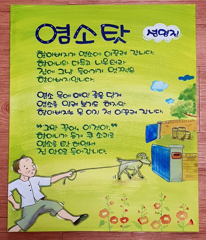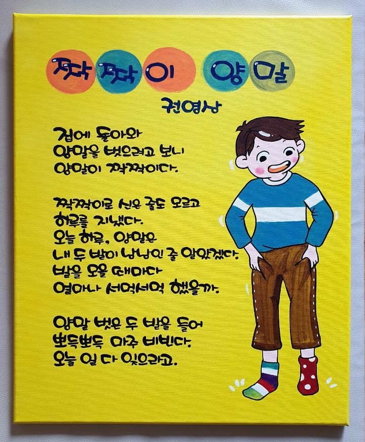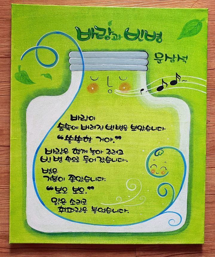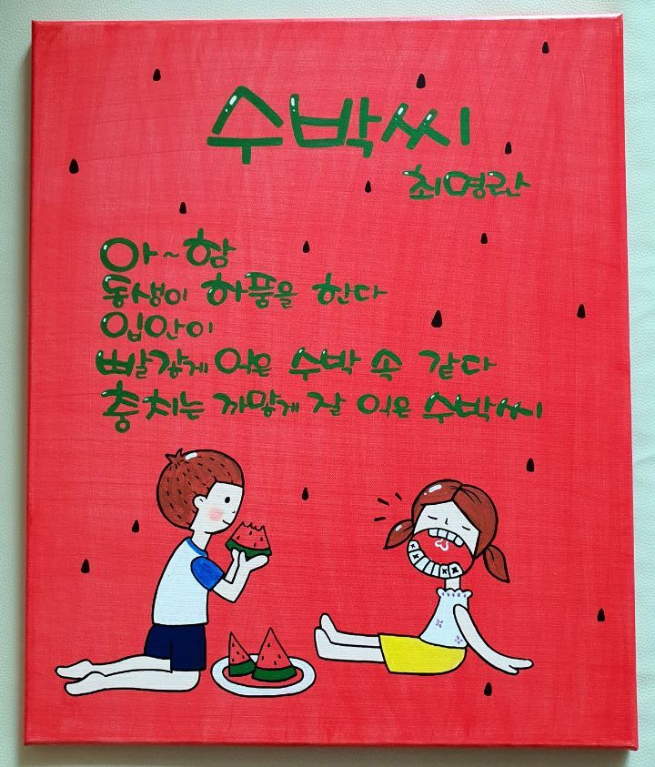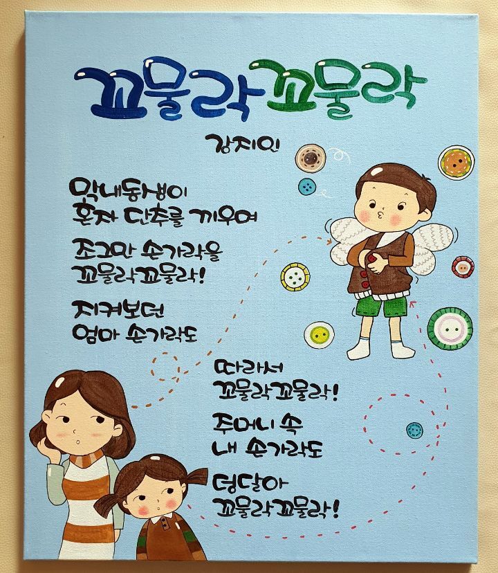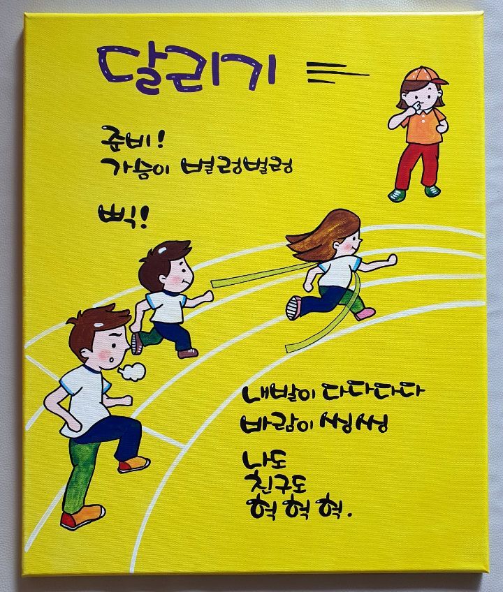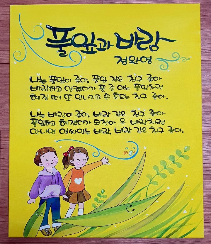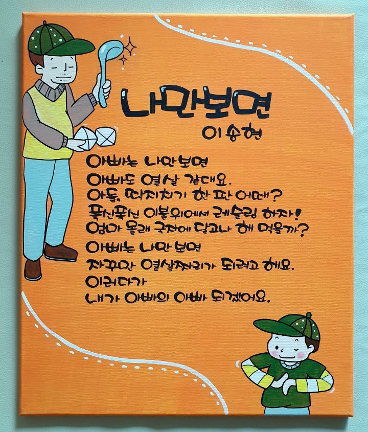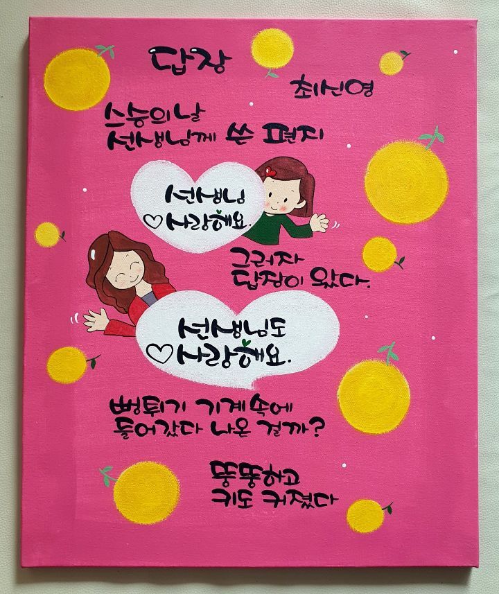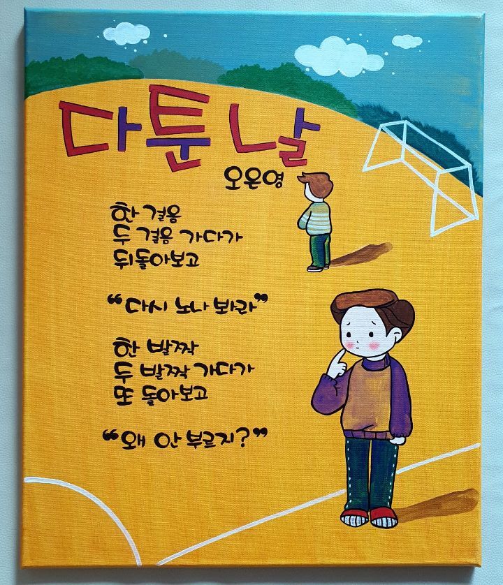 젯소칠2번->바탕배경색2~3번->밑그림(연필,파스텔연필)->이미지채색->동시쓰기->검정라인->하이라이트등..->바니쉬칠2번->중화제1번->뒷면에 마끈과 타카로 액자끈달기