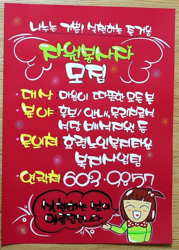 자원봉사자모집 작성자이지현|작성시간11.06.29|조회수9 목록 댓글 0 글자크기 작게가 글자크기 크게가 다음검색 현재 게시글 추가 기능 열기 북마크 공유하기 신고 센터로 신고 댓글 댓글 0 댓글쓰기 댓글 리스트