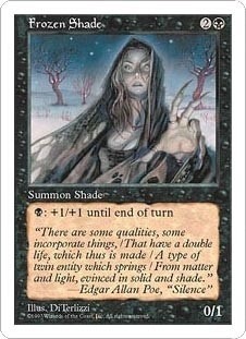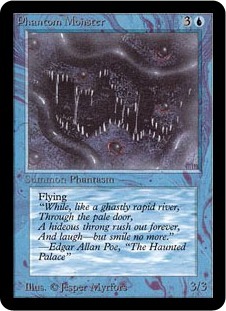 Edgar Allan Poe의 작품이 가장 먼저 등장한 카드는 Alpha의 Phantom Monster와 Frozen Shade입니다. Phantom Monster는 별다른 개성없는 3/3 비행생물이지만, Poe의 명작인 The Haunted Palace(귀신들린 궁전)의 일부가 인용되어 있습니다.