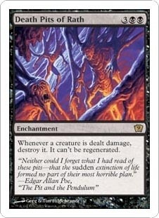 Death Pits of Rath는 8판과 9판에서 Poe의 단편소설인 ‘The Pit and the Pendulum(구덩이와 추)’의 일부분을 인용하고 있습니다. 구덩이와 추는 이단심문을 당하는 주인공이 함정 속에서 고통받는 내용인데..짧게 설명하자면 19세기판 쏘우입니다. -_- 자넨 가톨릭을 소중히 하지 않았지! 게임을 시작한다! (이런걸 쓰니까 수능에 못나오고..) 원작의 공포스러운 분위기와 카드의 느낌이 잘 어울립니다.