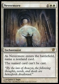 사실 앞부분 얘기까지는 인트로였습니다. 오늘 칼럼의 주인공은 이니스트라드에 등장한 ‘금지령’(NaverNevermore)입니다. 고딕 호러풍 배경인 이니스트라드에서 뜬금없이 백색에 ‘금지령’이 등장한 이유에 대해 의문을 가지는 분도 계시겠지만(사실 개인적으론 금지령보다 녹색의 플루타르코스 영웅전(Parallel Lives)가 더 뜬금없어보여염), 사실 ‘Nevermore’만큼 이니스트라드와 어울리는 카드도 없습니다. Poe의 유명한 시, ‘갈가마귀(The Raven)’에서 나온 유명한 구절이기 때문입니다. 일단 뭔가 까마귀가 나왔을 때 주변 양키친구가 Nevermore드립을 치면 여기서 나온거라고 생각하시면 됩니다.