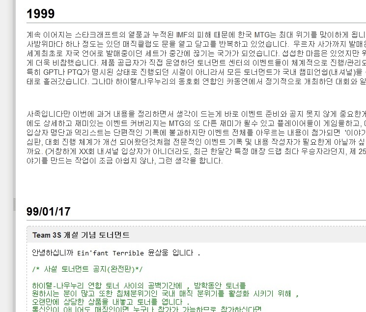 사 족입니다만 이번에 과거 내용을 정리하면서 생각이 드는게 바로 이벤트 준비와 공지 못지 않게 중요한게 결과에 대한 기록이라는 점입니다. 기록을 남기는 의미 외에도 상세하고 재미있는 이벤트 커버리지는 MTG의 또 다른 재미가 될수 있고 플레이어들이 게임을하고, 대회를 준비하는데 있어 큰 동기부여가 된다고 생각합니다. 입상자 명단과 덱리스트는 단편적인 기록에 불과하지만 이벤트 전체를 아우르는 내용이 첨가되면 '이야기'가 되니까요. 과거 많은 사람들의 노력과 시간을 통해서 심판, 대회 진행 체계가 개선 되어왔던것처럼 전문적인 이벤트 기록 및 내용 작성자가 필요한게 아닐까 싶습니다. 기록이 남으면 의미 있는 값으로 활용할 수 있으니까요. (거창하게 XX회 내셔널 입상자가 아니더라도, 최근 한달간 특정 매장 드랩 최다 우승자라던지, 제 255회 우리 매장 드래프트 우승자라던지요) 기록을 통해서 이야기를 만드는 작업이 조금 아쉽지 않나, 그런 생각을 합니다.