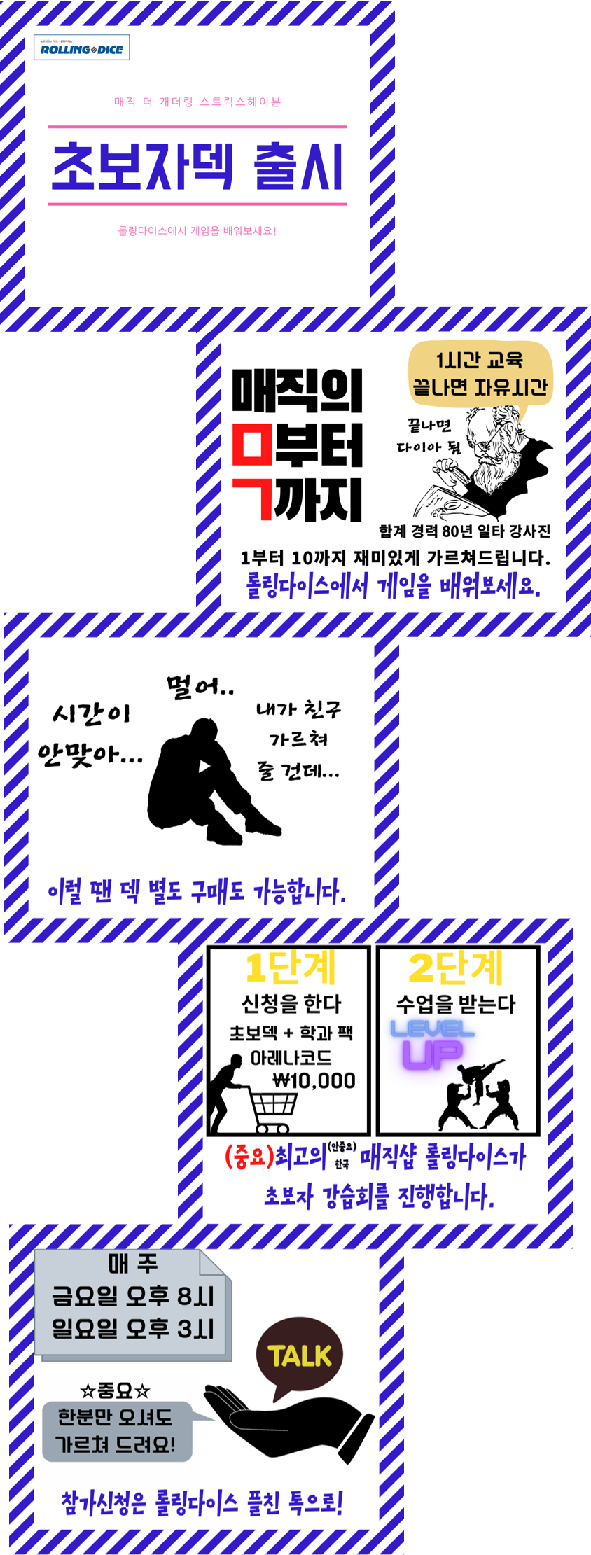롤링다이스에서 매주 금요일 오후 8시, 일요일 오후 3시에 초보자 강습회를 진행합니다.