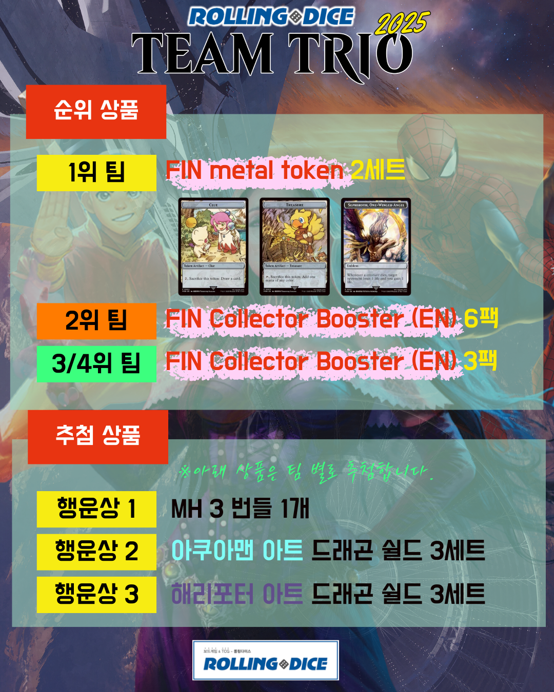 올해 롤링다이스 팀 트리오는 12월 6일 토요일 오후 12시에 시작하며, 파이널 판타지가 발매된 해 답게 이번 년도의 팀 트리오도 FIN 관련 상품들로 준비가 되었습니다.