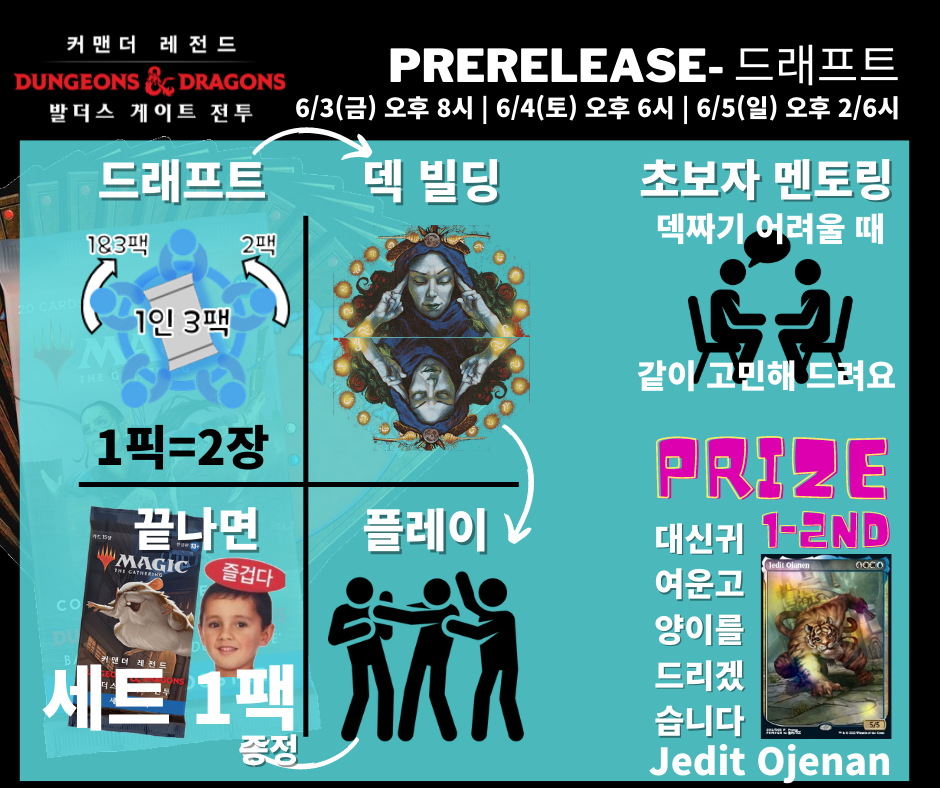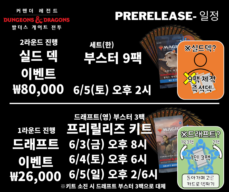 이번 프리릴리즈는 커맨더 포맷의 특성상 다인전 이벤트이며, 드래프트와 실덱으로 진행됩니다.
