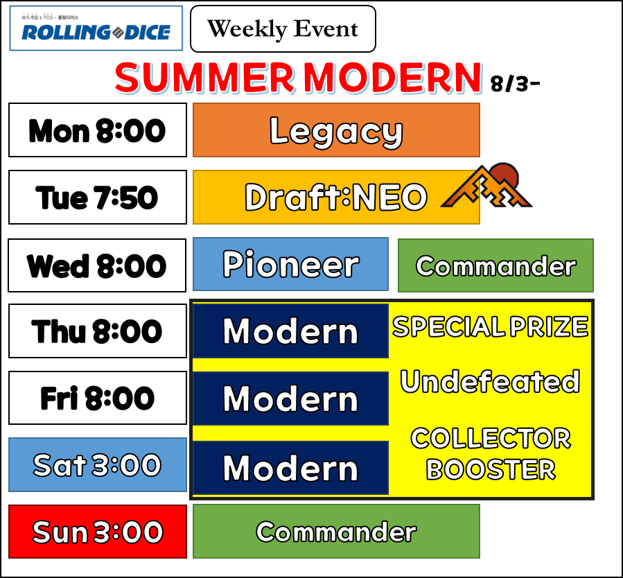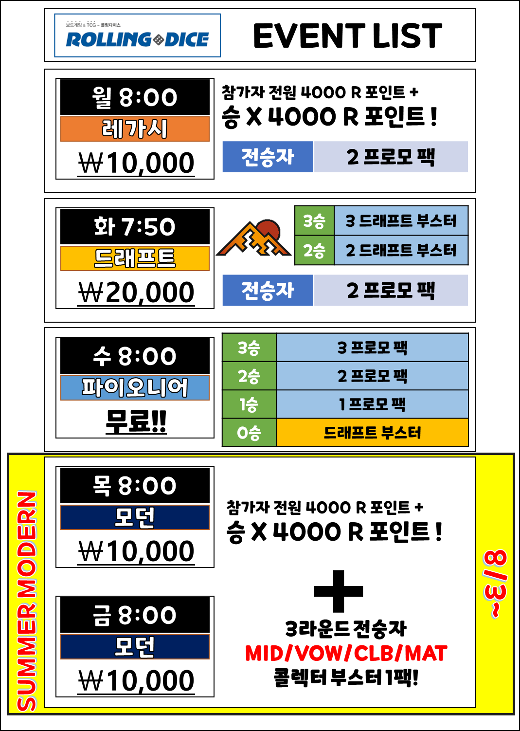 *무료 이벤트를 제외한 모던, 파이오니어 이벤트는 대여덱으로 참가가 가능합니다. 매장에 문의해 주세요.