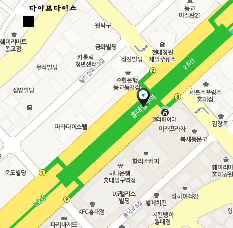 홍대입구역 2번출구에서 매우 가깝습니다!