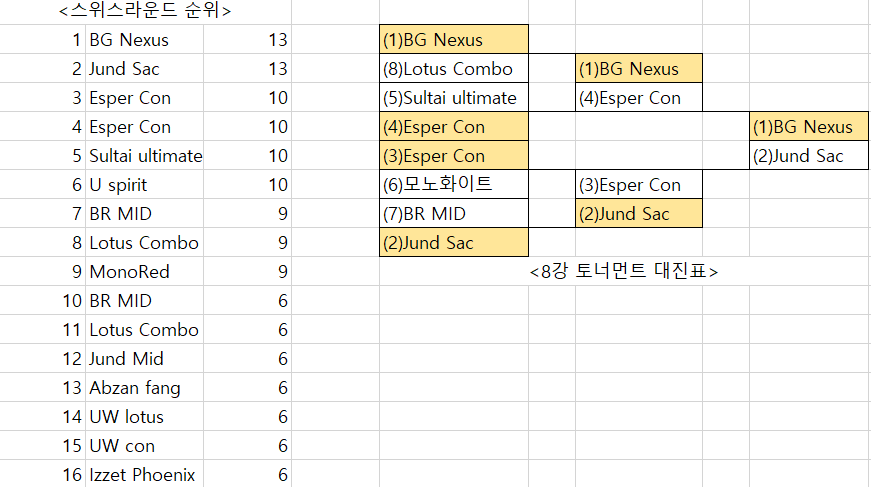 8강전은 에스퍼 컨트롤이 2명이나 올라와서 컨트롤의 위상을 보여주었습니다. 에스퍼컨과 술타이 얼티메이텀의 경기가 라운드시간 종료후 추가 5턴까지 가는 상황이 만들어져서 보는 사람들 또한 아주 재미있게 보았습니다.