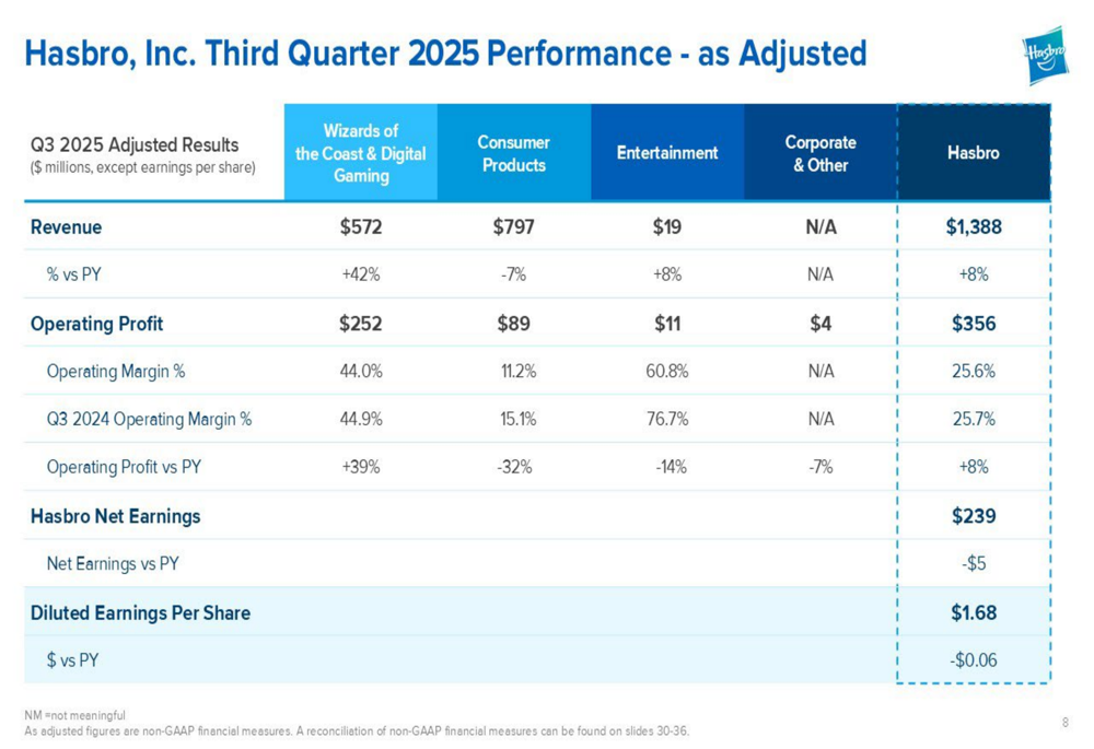 뭐 이에 힘입어 해즈브로는 Q2에 -1%였던 전년 대비 매출을 매직이 42%(이게 출시 30년째 게임에서 가능한 수치냐) 나 끌어올리면서 해즈브로는 전년 Q3대비 +8% 의 매출을 기록하였습니다.