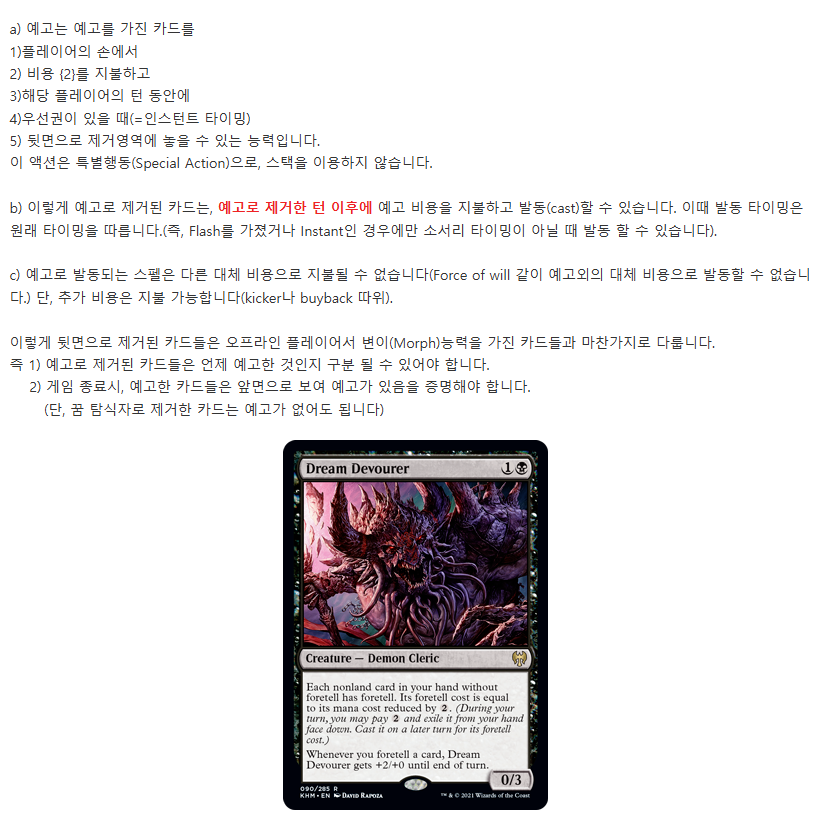 Foretell(예고) 능력은 자신의 턴 동안, {2}를 지불하고 예고가 있는 카드를 뒷면으로 하여 제거 영역에 두고,