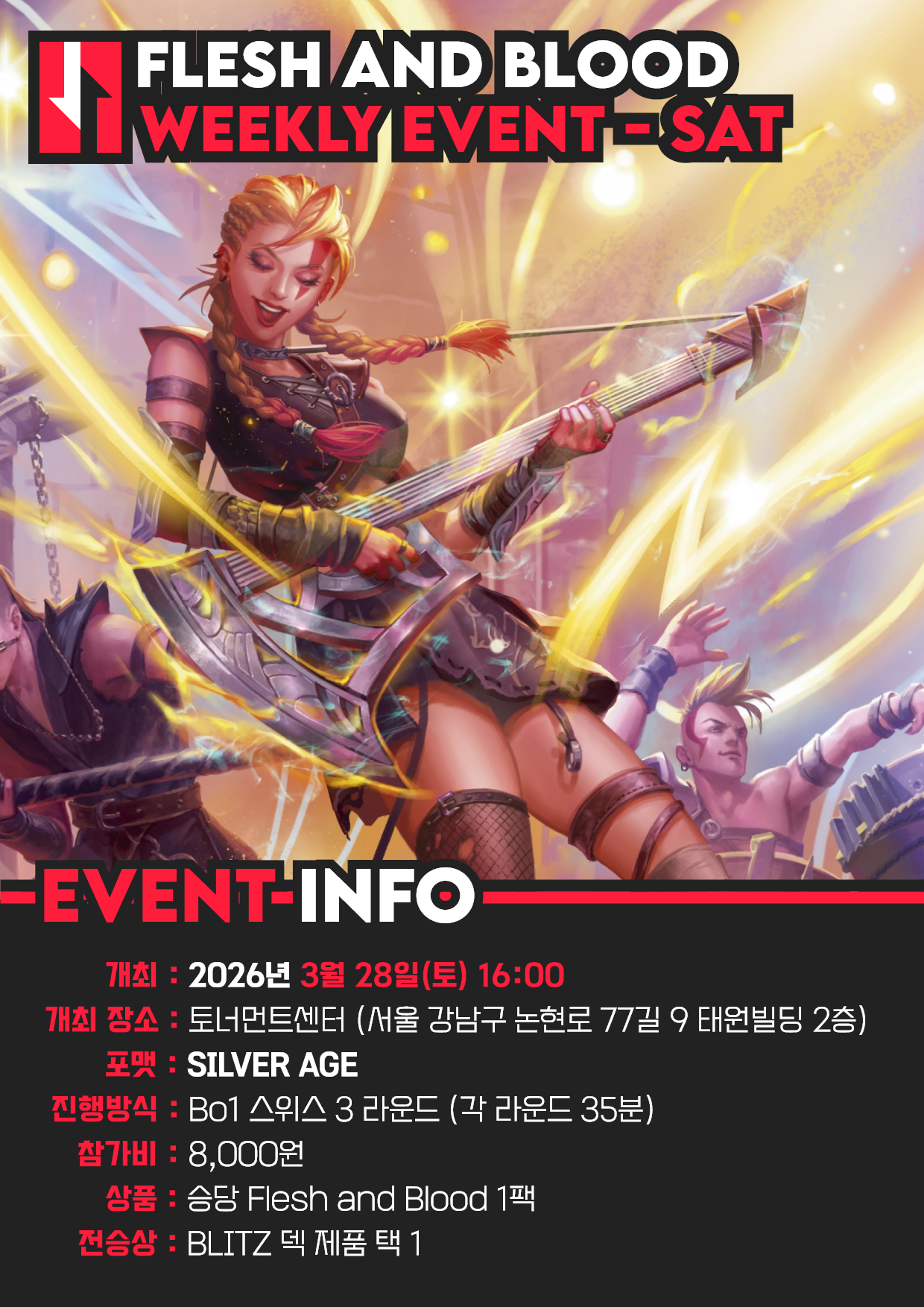 3월 28일 토요일에 진행되는 Armory Event는 매장 사정에 따라 3월 23일 월요일에 진행되는 위클리 이벤트와 일정이 서로 변경되어 진행됩니다.
