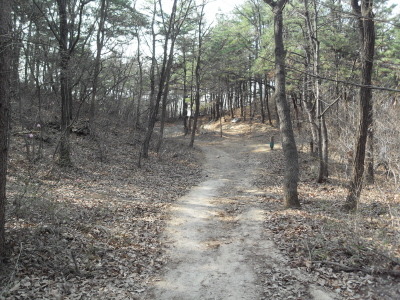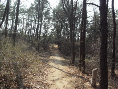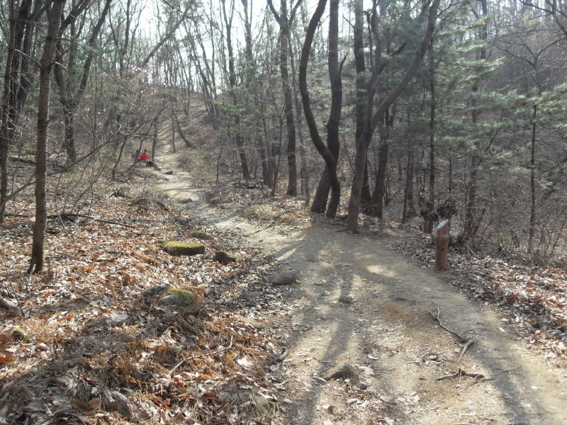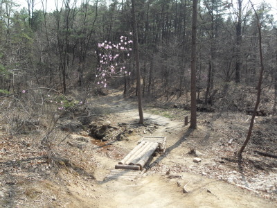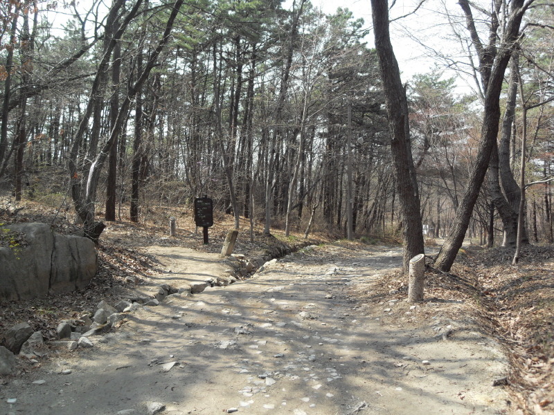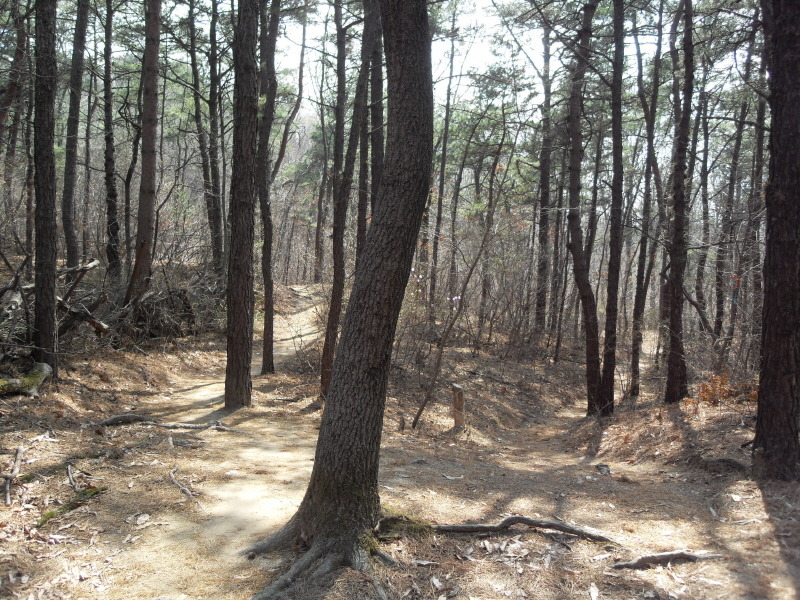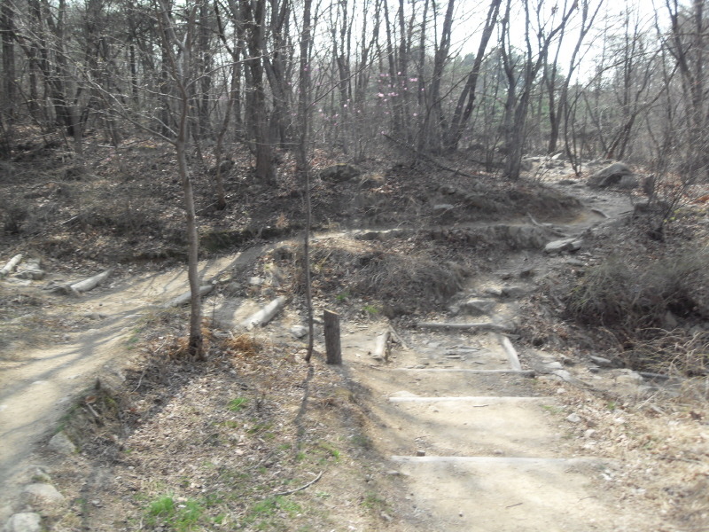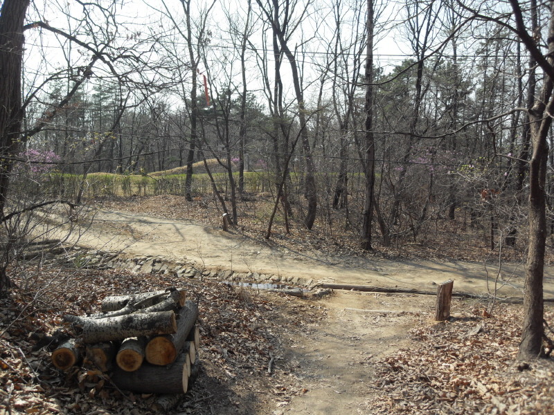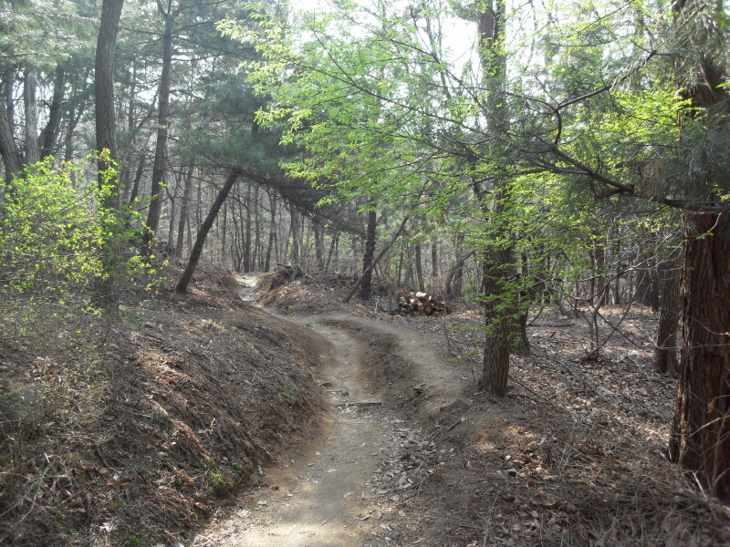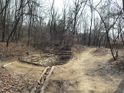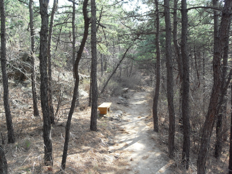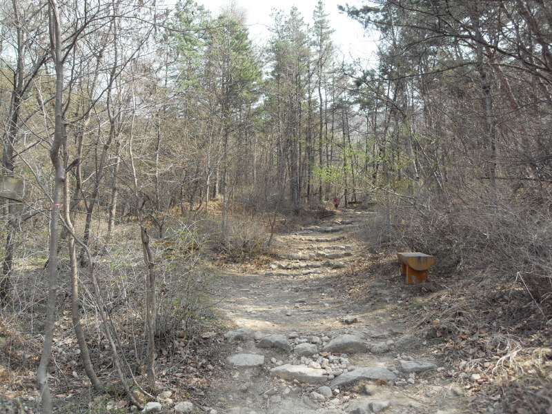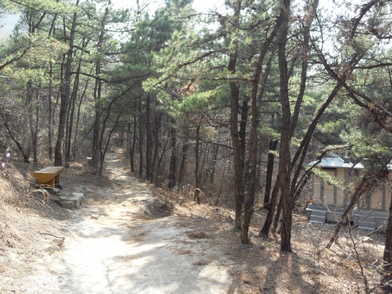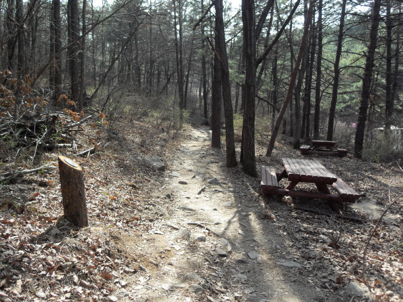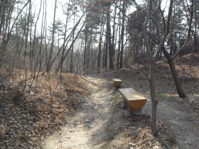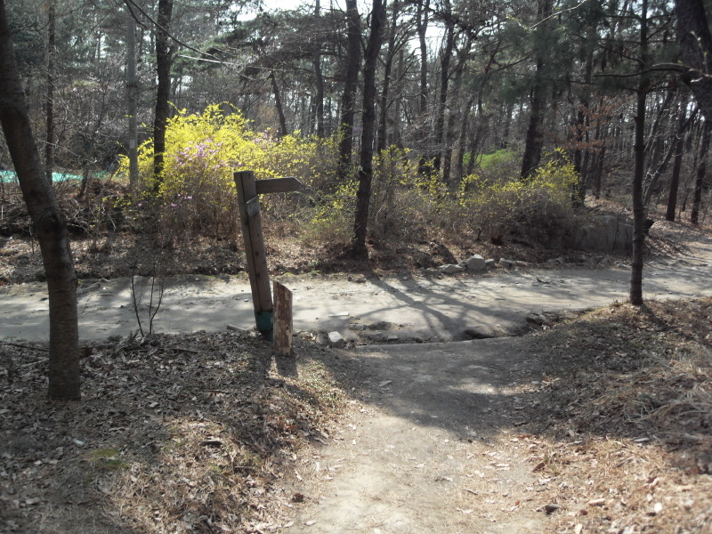 ]위치표시판 옆 길로 들어서면 ┼자 사거리. 직진 길로 진행하여 폭 좁은 계류위에 설치된 통나무다리를 건너 통나무 계단길을 오르면 우측 나무 아래 평상 하나가 놓여있는 나지막한 고갯마루를 넘어 편안한 숲길을 내려가게 된다.