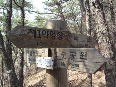 이정표(←성주암 450m<8분>/↓제1광장 900m<15분>)가 설치된 갈림길 좌측 아래에는 정자 쉼터가 보이고, 직진 길로 들어서면 용하배드민턴장과 운동시설들이 눈에 들어온다.