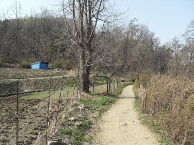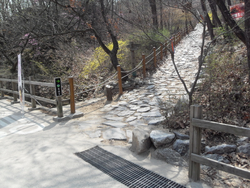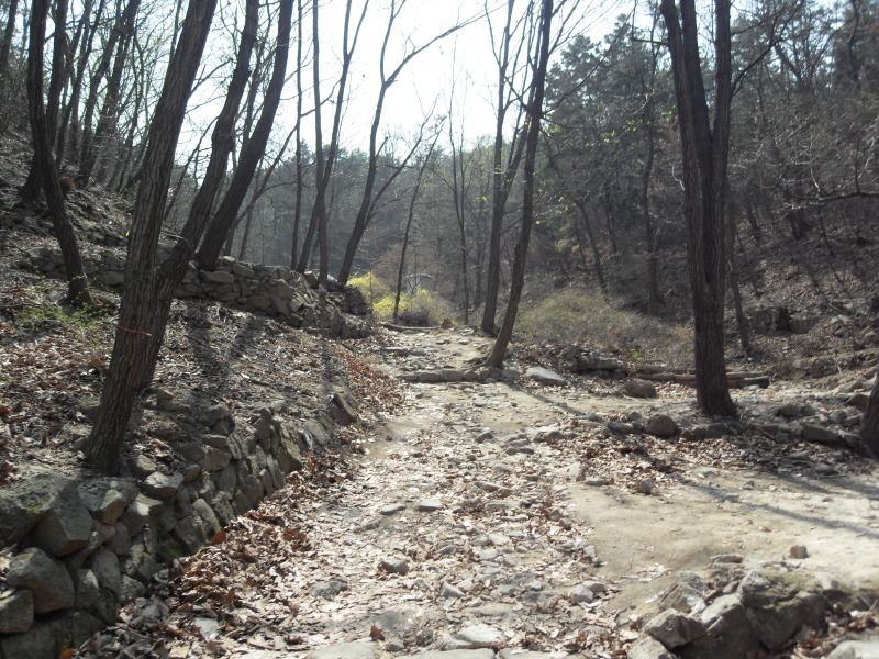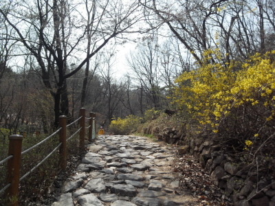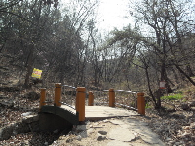 사거리를 뒤로 하고 직진 길을 따르면 1분 후 시멘트와 돌로 깨끗하게 축대를 쌓아 정비해 놓은 계곡을 건너 전혀 부담이 없는 편안한 산책로를 이어가게 된다.