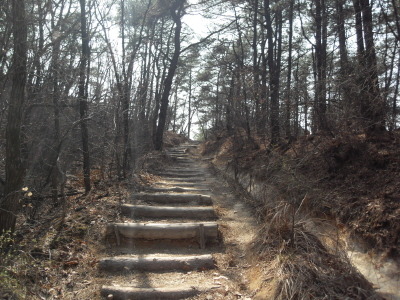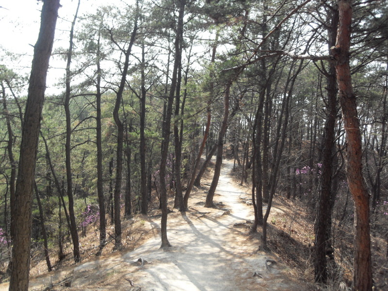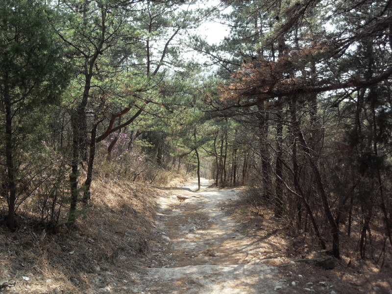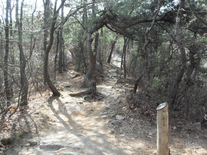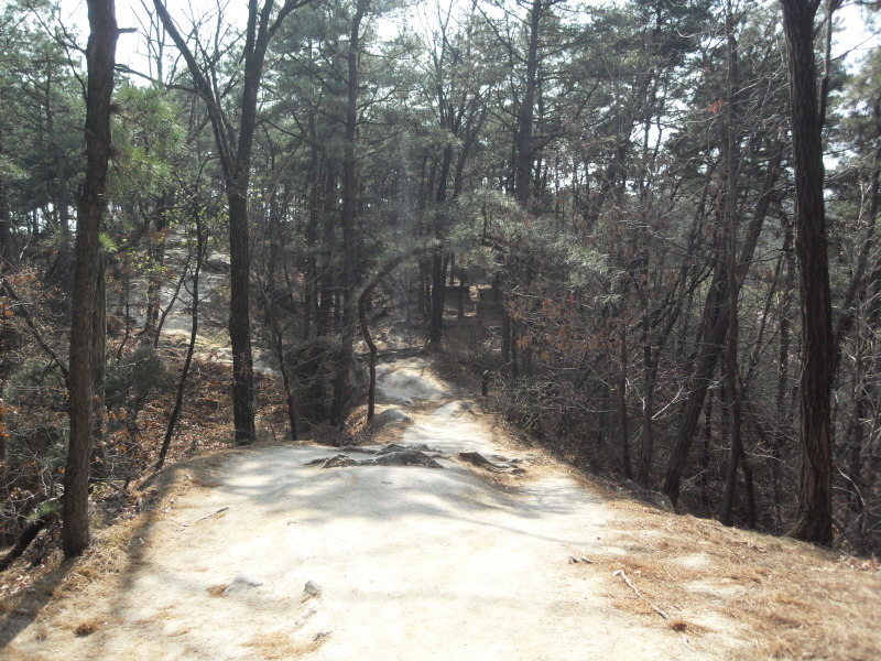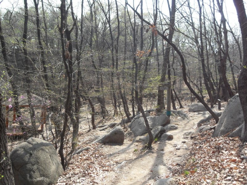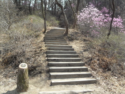 직진의 길을 계속 따르면 작은 다리를 건너 산길로 들어서 배드민턴장을 지나 나무계단을 오르면 돌산능선에 올라서게 된다.