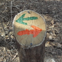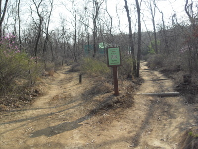 좌측으로 방향을 바꾸어 진행하면 둘레길의 방향을 알려주는 화살표 표시가 된 표시목이 있는 Y자 갈림길에서 우측 길을 따른다.