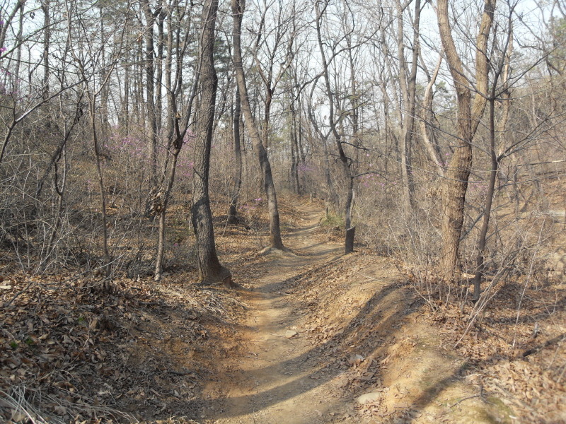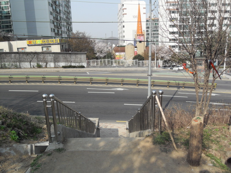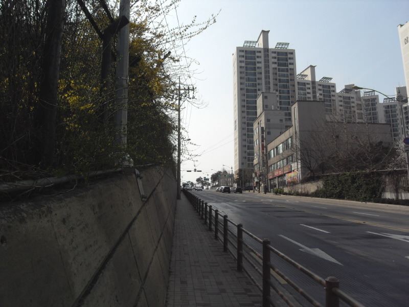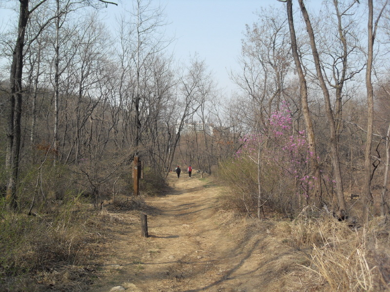 편안하게 둘레길을 따라 가면 진행 방향으로 아파트 단지가 보이고, 산길 끝 계단길을 내려서면 4차선 포장도로가 앞을 가로 막는다.