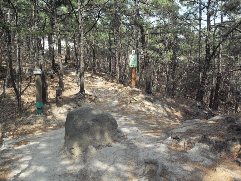 전망바위를 뒤로 하고 편안하게 소나무 숲길을 이어가 갈림길에서 직진의 234암봉으로 이어지는 돌산능선 주등산로를 버리고 234봉을 우측에 두고 우회하는 좌측 사면길로 진행하면 ├자 갈림길인 성주암갈림길에 이르게 된다.