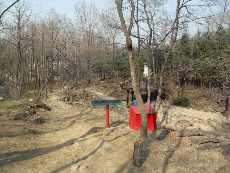 약수터를 지나자마자 갈림길 입구에 이정표(←호압사 900m<20분>/↓산장아파트 300m<4분>/↓천주교성지 600m<9분>)가 있다.