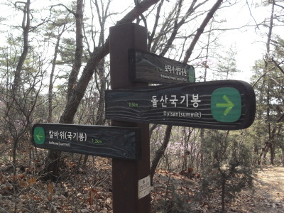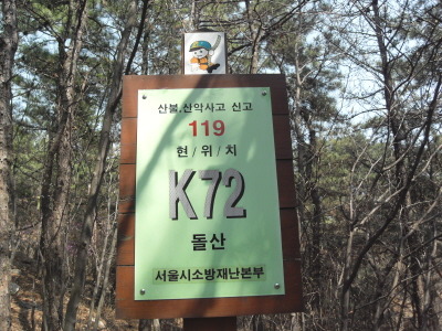 이정표(←제1야영장 1.8km<50분>/↑신림9동 700m<10분>/↓호수공원 900m<15분>/→돌산 150m<3분>)와 위치표시 '현위치 K72 돌산'이 있는 능선사거리로 좌측의 돌산능선 등산로를 따라 이어가게 된다.