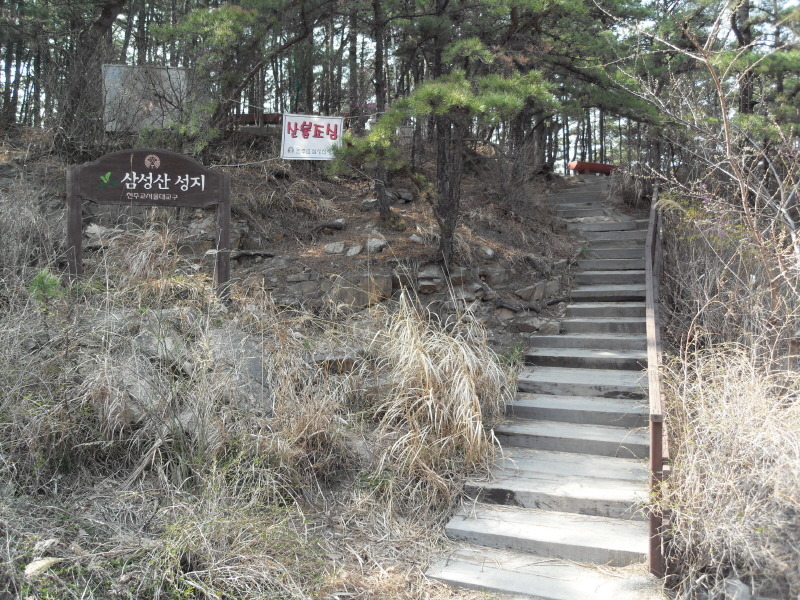 음용부적합의 약수터 앞 공터에도 정자 쉼터가 있고, 정면 끝에는 커다란 '삼성산 성지' 푯말이 보이며, 푯말 우측에는 삼성산 성지로 오르는 나무계단길이 있다.