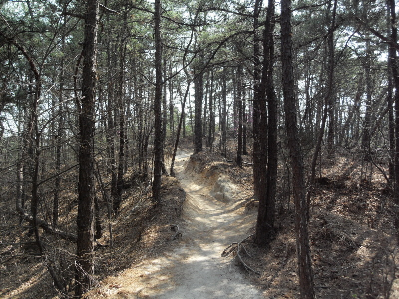 나지막한 고갯마루를 넘어 내려가는 편안한 숲길(사진 下)