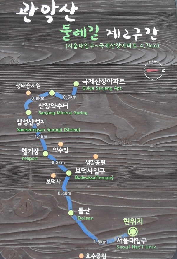 【 걷기코스 】서울대입구/정문→관악산 등산로입구/제1구간 & 제2구간 분기지점→돌산능선입구/돌산갈림길→경로구역/정자쉼터→돌산능선/주등산로→전망바위→성주암갈림길/용하배드민턴장→능선사거리/위치표시:돌산→성주암뒤/보덕사갈림길→보덕사입구→헬기장→장군봉.삼성산주등산로와 만나는 사거리/삼막사(←3km)갈림길→삼호약수터/삼성산성지→억년약수터입구→만년약수입구→산장약수터→4차선포장도로→국제산장아파트 앞/제2,3구간분기점