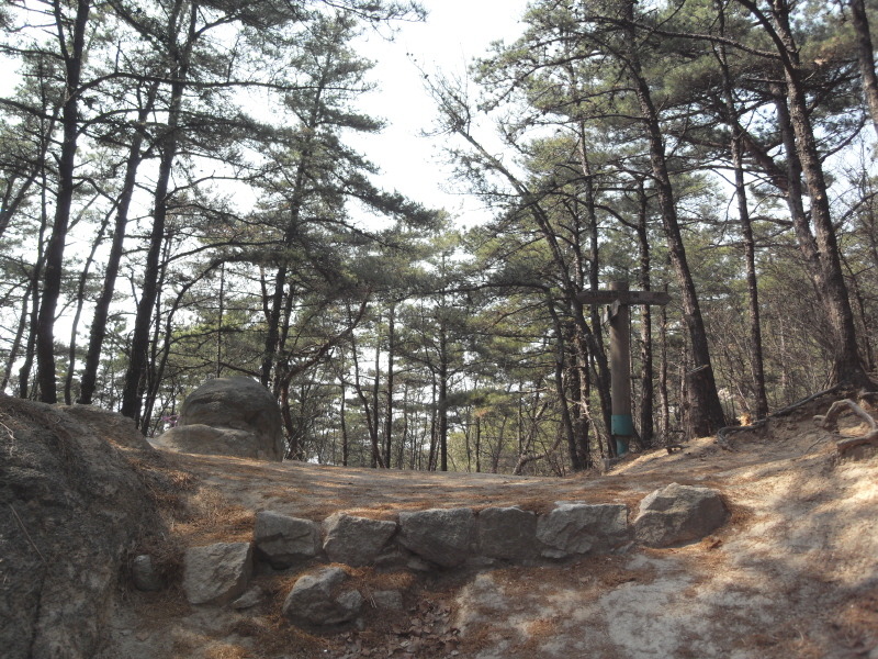 좌측 10여m 떨어진 곳 등산로에 이정표(←삼막사 3km<70분>칼바위<국기봉> 1.2km/↓애산회관 900m<15분>/→활터 200m<3분>)가 있고, 주변에는 나무벤치와 평상들이 보인다.