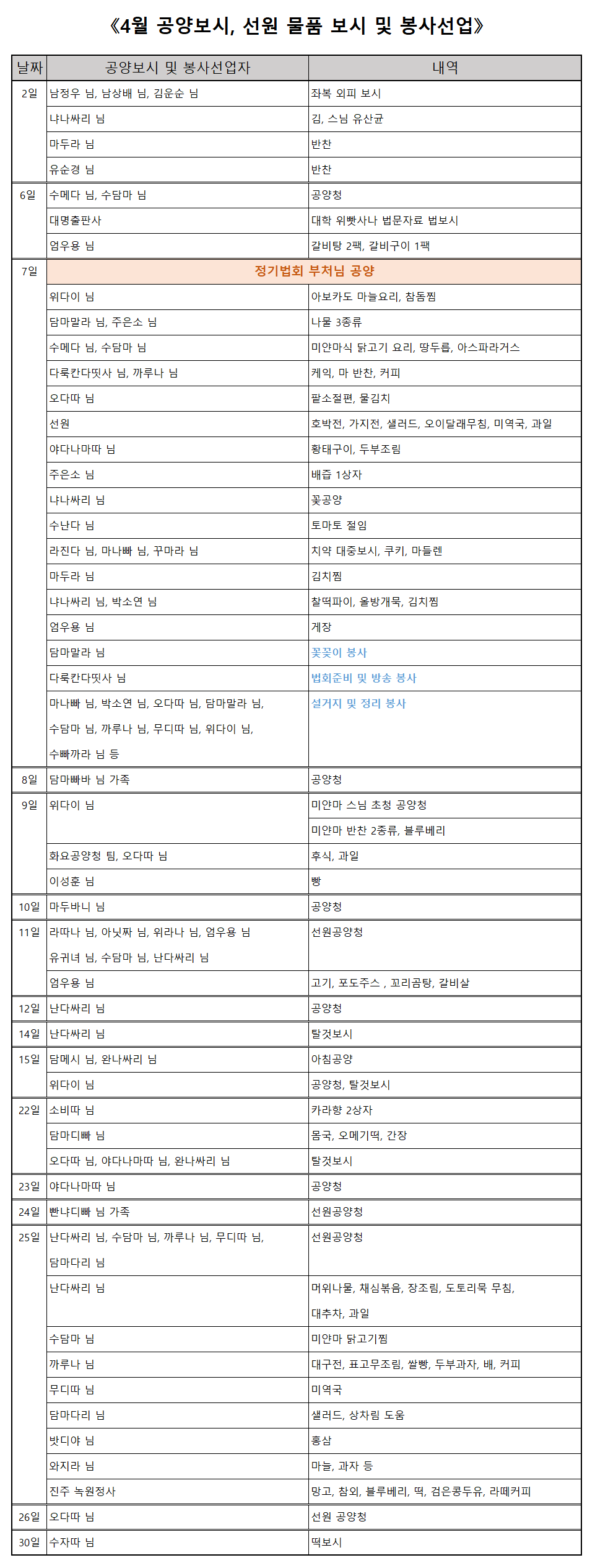 2019년 4월 공양 및 필요물품 보시해 주시고 봉사선업지으신 분들께 깊은 감사드립니다.