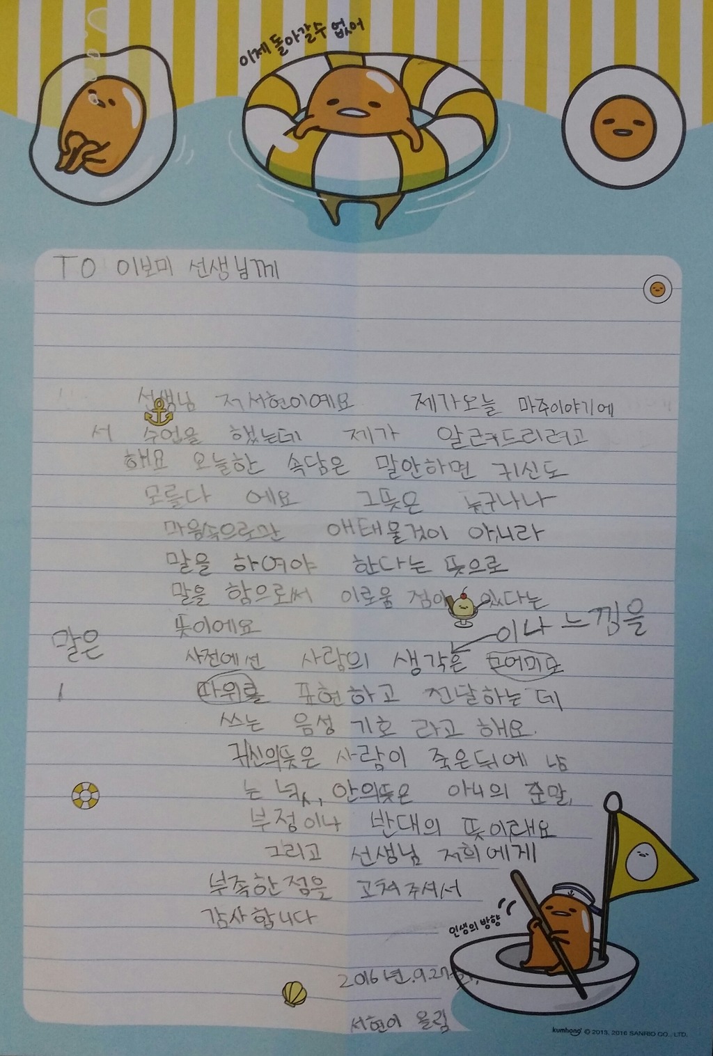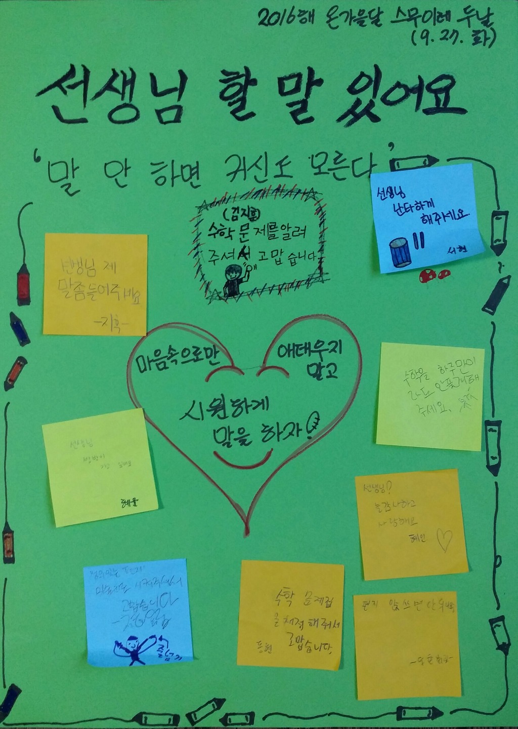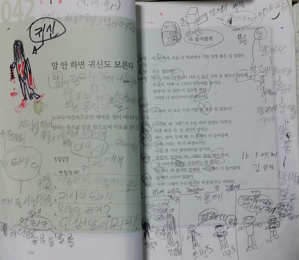 ‘말 한 하면 귀신도 모른다’ 속담을 배우면서 우리가 학교 다닐 때 생각이 났어. 서로의 마음을 몰라준다고 토라져서 며칠 동안 말도 안하고 그랬잖아. 말하지 않고 서로 오해만 했었지. 지금 생각하면 왜 그렇게 했는지 웃음이 나와. 마음속으로만 애태우지 말고 속 시원하게 말을 해야 알지 어떻게 마음속을 다 알겠니. 언제나 고마운 친구야, 우리 사이는 잘 들어주고 알아주는 친구가 되자.