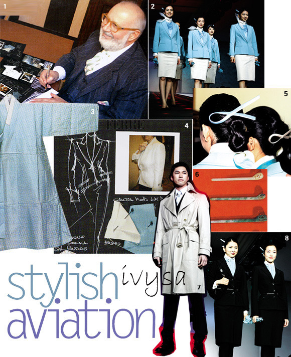 1 대한항공의 새 유니폼을 디자인한 페레.2 곧 만나게 될 스튜어디스의 메인 룩. 3 한복의 두루마기와 도자기에서 영감을 받은 청자색. 4 페레의 디자인 노트. 5.6 비녀에서 영감을 받은 헤어 장식.7 스튜어드의 아웃웨어인 트렌치 코트. 8 대한항공의 지상 근무원 룩.