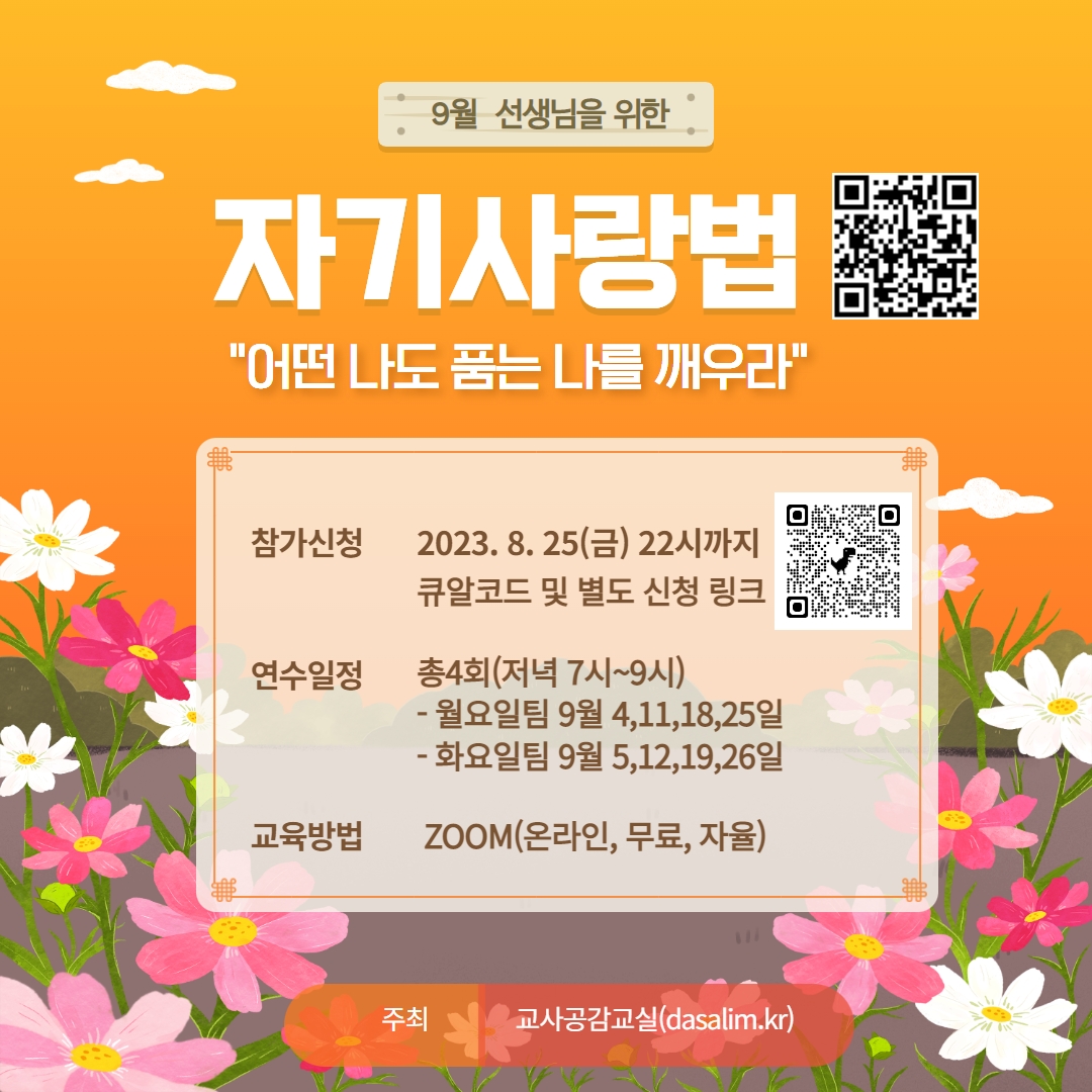 ☀ 9월, 선생님을 위한 자기사랑법 연수(무료, 자율, 소그룹실습 중심, zoom) 안내