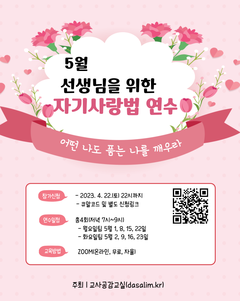 ☀ 5월, 선생님을 위한 자기사랑법 연수(무료, 자율, 소그룹실습 중심, zoom) 안내