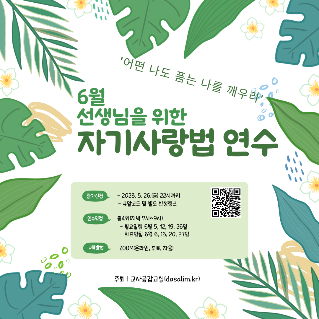 ☀ 6월, 선생님을 위한 자기사랑법 연수(무료, 자율, 소그룹실습 중심, zoom) 안내