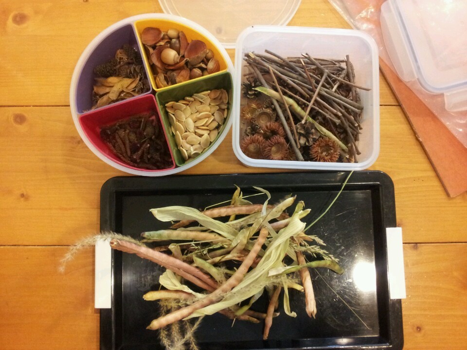 준비된 박스 종이에 자신의 이름을 쓰고 선생님이 글루건 쏘아주면그 위에 마음에 드는 자연물을 올려서 완성합니다. | 준비된 자연물 -호박씨 콩깍지, 나뭇가지, 도토리, 오리나무열매, 밤쭉정이.... |