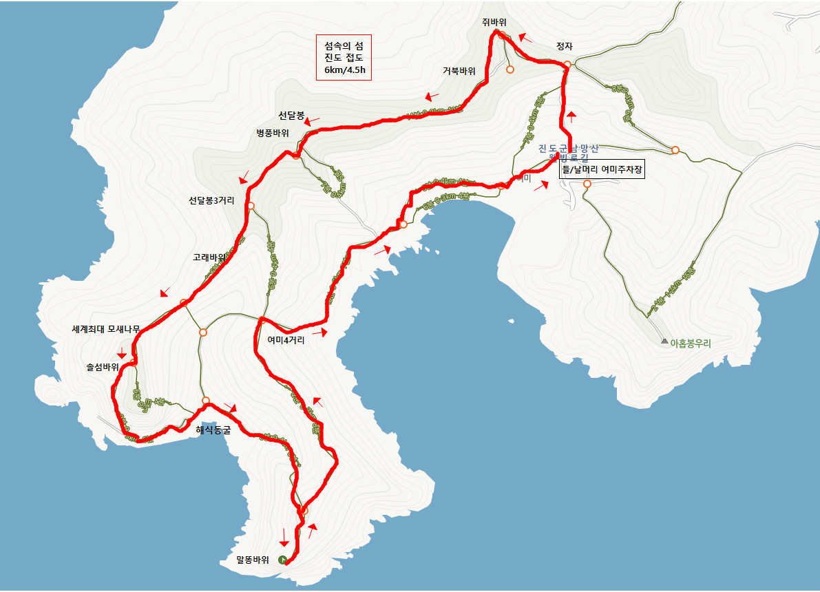 | 산행코스 | 진도 접도(섬속의 섬) + 금골산(진도 설악산) 연계산행 1부 진도 접도 여미주차장~쥐바위~병풍바위~선달봉~솔섬바위~해식동굴~말통바위~여미사거리~여미주차장 🕐 6KM/4시간30분 1부 접도 산행후 버스로 이동하여 2부 금골산 산행 2부금골산 주차장(화장실)~금골산 5층석탑해언사~작은금골~마애여래좌상(타포니동굴)~빽~작은동굴~작은금골~금골산~명태바위~통천문~정자~고인돌~금골산 5층석탑~ 주차장 🕐 3km/2시간 ☞ 산행코스는 현지상황에 따라 변경될 수 있습니다. |