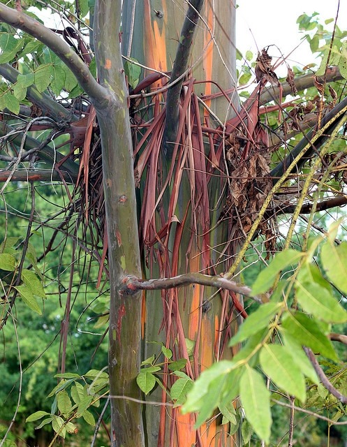 이렇게 아름다운 색깔을 지니게 된 원인은, 동물이 털갈이 하듯이 매년 허물을 벗는데 나무껍질이 각기 다른 시기에 벗겨지기 때문이다. 겉껍질이 벗겨지면서 초록색의 목피가 드러나고 시간이 지남에 따라 노랑색, 회색, 청색, 오렌지색, 보라색, 밤색, 붉은색 등으로 색깔이 점점 변한다.