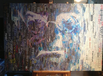 아래 <텍스트의 생산자>는 스티브잡스의 스텐포드 대학 연설 오프닝에서 세 가지 주제를 이야기할 것을 명확히 말하고 시작되는 연설문을 의도한 텍스트로 대학관련 잡지와 신문에서 선택한 직간접 데이터를 가지고 '스토리'를 꾸며 나아갔다. 밝은 면은 실천과 희망적인 텍스트를 응집시키고 어두운 면에는 사회 일면이나 이슈 등 관심 부분의 텍스트를 무차별적으로 중첩하여 <그>의 얼굴 이미지를 인식되도록 표현하고 있다. 인식된 이미지는 네거티브로 전환시켜 텍스트의 대량 생산의 제공자로써 텍스트의 과잉으로 잊혀져가는 시간의 과정을 보이고자 하였다. 켄 앱터카의 작업에서 그가 전하고자 했던 밑그림의 시각적 언어와 유리면에 쓰인 텍스트는 다중적인 상호관계를 유지하고 있으나 <텍스트생산자>는 과잉된 정보가 수신자와 송신자의 전달을 혼란스럽게 하고 정보의 본질까지도 파악하기 힘든 매체로서 작용한다. 그리고 텍스트는 언어 기호체로서 기의적인 의도만 선행되고 본질(밑그림)의 정보와 단절되는 물성을 우선한다. 수신자가 얻게 되는 정보는 텍스트의 중첩에서 일어난 희미한 이미지에서 유추할 수밖에 없다. 정보는 필요한 것이나 과잉된 정보는 수신자의 판단까지 흐리게 하는 노이즈 마케팅의 소비 형태로 오인되거나 작가와 관람자로부터 멀어질 수밖에 없을 것이다. 지식·정보를 자신의 맥락에서 재구성되는 연구자의 작업은 정체성을 깨우는 옵티컬이미지를 제시하는 방식이다. 여기에서 이미지의 선택은 <그>가 정보와 소통을 확장시킨 사회적 공헌을 긍정적으로 받아드리는 의미와 무책임한 텍스트의 난립 생산으로 예술의 본질까지도 변질될 수 있는 네거티브의 환경을 제시하고자하는 의도도 담겨있다.