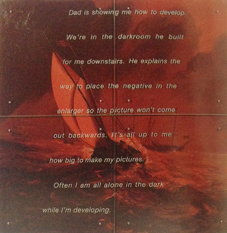 이 그림은 18세기 초반 네덜란드 작가 빌럼판 펠더 2세(Willem Van de Velde the Younger)의 바다 풍경위에 작가 켄 앱터카(Ken Aptekar)는 자신의 어린 시절에 아버지가 가르쳐준 암실 현상법을 중심으로 한 이야기를 텍스트로 적어 넣은 작품이다. 이 작업에서 작가는 그림을 네거티브로 전환시켜 항해사의 지도가 없는 상황을 아이의 불안한 심리로 묘사한 이중적 의미를 암시한다. 텍스트는 유리판 위에 쓰여 이미지와 텍스트가 상호작용으로 관람자를 담론에 끌어 들이는 의도를 보인다. 작가는 작업에서 푸른 망망대해의 원본을 붉은 색으로 전환시켜 바다가 가지고 있는 넓은 공간과 거친 파도의 험난한 과정을 반전하여 시각적 요소와 시공의 환경을 끌어 들이고 이를 작가의 인생 여정으로 코드화 시켰다. 작업에서 패널의 4조각은 크기의 운반을 고려한 의도보다 타인의 심리적 공유 대상을 창을 통해 보는 관망자의 파편적 기억을 의도한 작업과정으로 읽혀진다. 이미지는 작가의 삶의 배경을 설명하기에는 많은 이야기들을 거친 바다의 시각적 이미지 언어로 전달하고 텍스트는 이미지로 설명할 수 없는 기록을 유리판위에 텍스트로 한 화면에 제시하였다. 실제 이미지는 작가와 무관한 차용의 대체물이고 반전은 작가의 맥락으로 전환 시킨 인식으로 읽혀진다. 유리판을 투사한 이미지는 작가의 메시지 정보를 심화시키는 매체로 기용되었다고 보는 것이다. 시간과 공간의 의도적인 오브제로 대체되어지는 것으로 보인다.