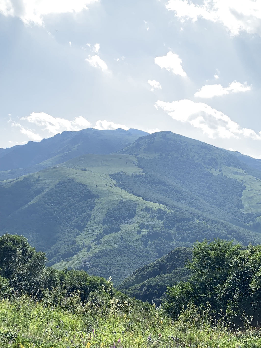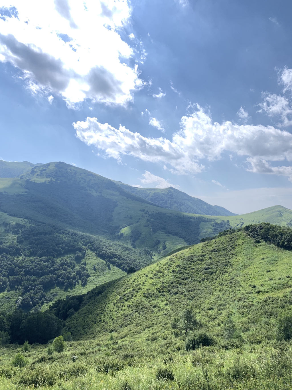 高山草甸、白桦林、松树林、满山野花.