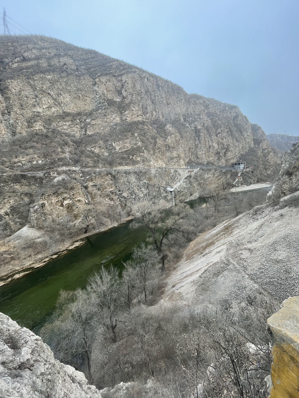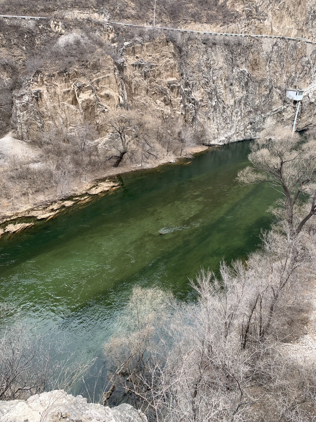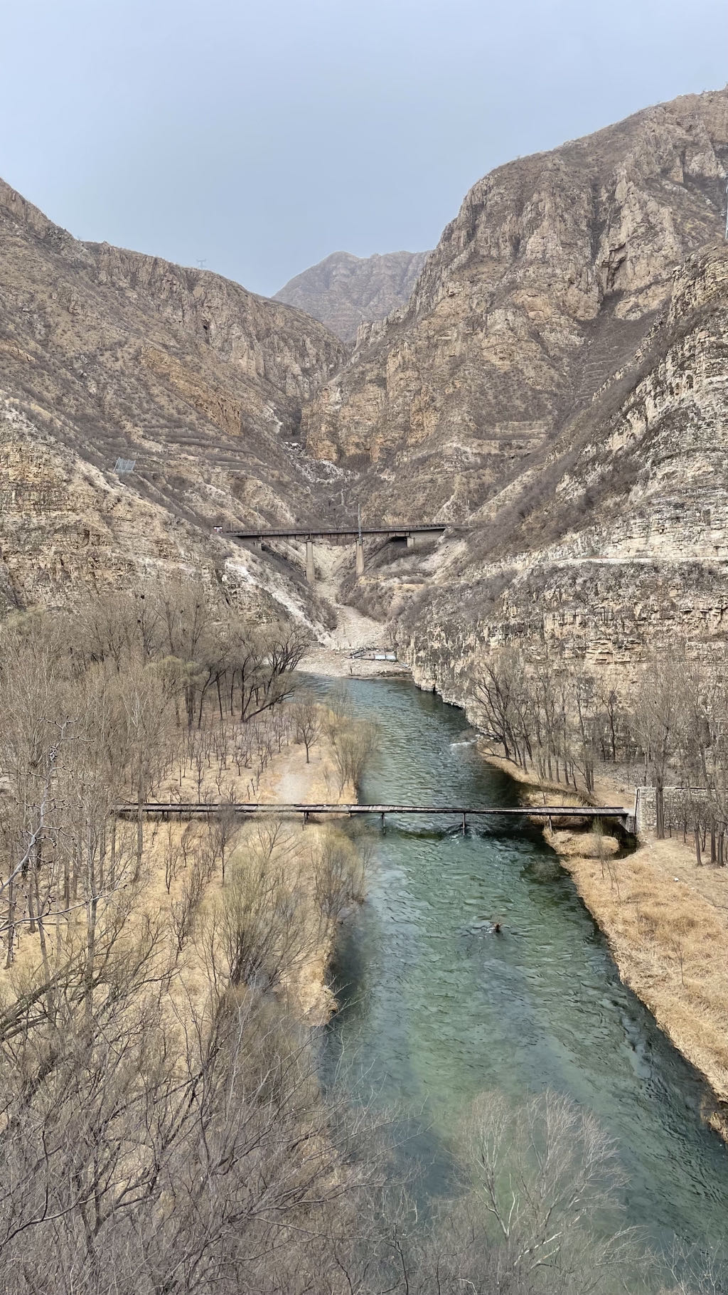 永定河像一条苍龙,冲入群山,这里才是真正的大江峡谷,河谷两侧山崖壁立,山体由石灰岩构成,深度风化,两岸山色干枯,植被稀疏,但是风景一样壮丽.幽州大峡谷是和白河峡谷并称的北京著名的峡谷景观带.