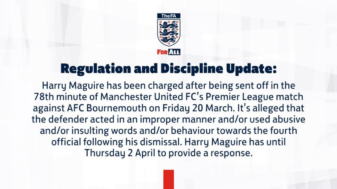 - 해리 매과이어는 3월 20일 금요일에 열린 맨체스터 유나이티드와 AFC 본머스와의 프리미어 리그 경기에서 후반 78분 퇴장을 당한 이후 저지른 언행으로 인해 징계 절차를 받게 되었음.