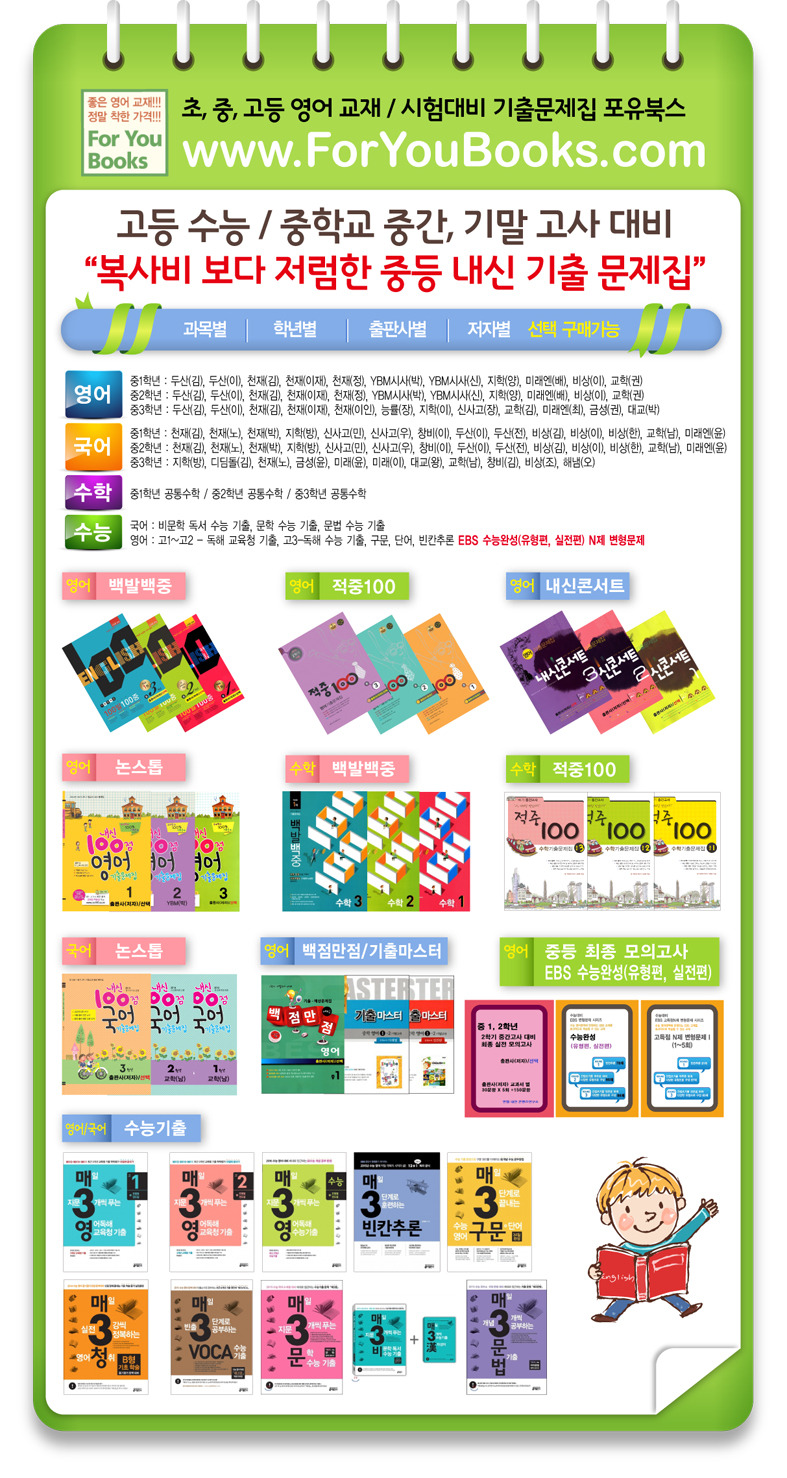 1,2학기 중간/기말고사 대비 기출문제집 총망라 - 실전모의고사 수능완성 실전편/유형편(한글파일) 최저가 작성자포토지니|작성시간14.10.28|조회수76 목록 댓글 0 글자크기 작게가 글자크기 크게가 다음검색 현재 게시글 추가 기능 열기 북마크 공유하기 신고 센터로 신고 댓글 댓글 0 댓글쓰기 답글쓰기 댓글 리스트