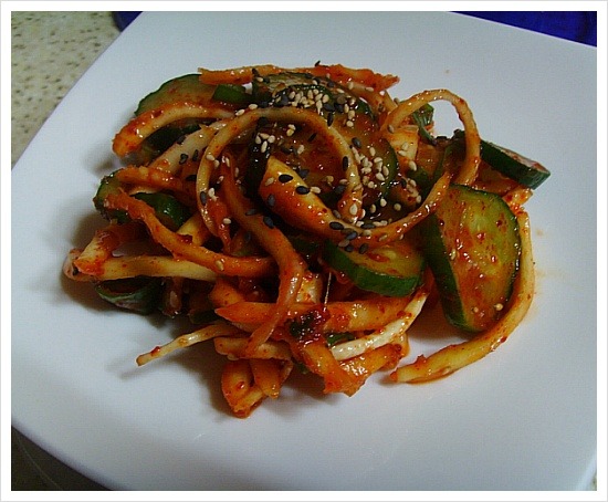 재료 : 깐도라지 한 줌, 오이2/1개,고추장2/1T,고춧가루1t,2배식초2t, 설탕1T,통깨
