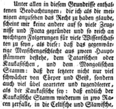 크리스토프 마이너스(Christoph Meiners)의 1785년 논문 '인류 역사의 개요(The Outline of History of Mankind)'는 코카서스인(카우카시쉬)이라는 용어를 더 넓은 인종적 의미로 사용한 최초의 작품이다. (텍스트 영어 번역을 보려면 이미지를 클릭하십시오)