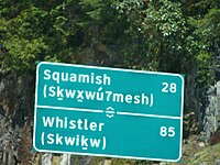 브리티시 컬럼비아의 도로 표지판은 스쿼미시에서 /ʔ/를 나타내기 위해 숫자 ⟨7⟩을 사용하는 것을 보여줍니다.