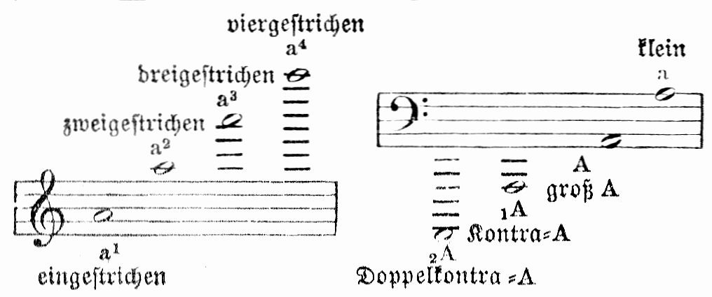 , 그러나 곧 두 배의 막대 ( , , ) 로 두 배를 나타내는 것을 선호했습니다 . 음조 체계가 더욱 확장 되면서 더 높은 음조 에도 두 개 이상의 획 이 주어졌고 (따라서 장조, 단조, 1옥타브, 2 옥타브 등 의 이름 이 붙었습니다 ) 장조 옥타브 아래의 음조 는 대문자 아래 에 획을 하나 더 붙여 지정되었습니다 (A = 콘트라 -A ) . 음악 예를 보세요 :